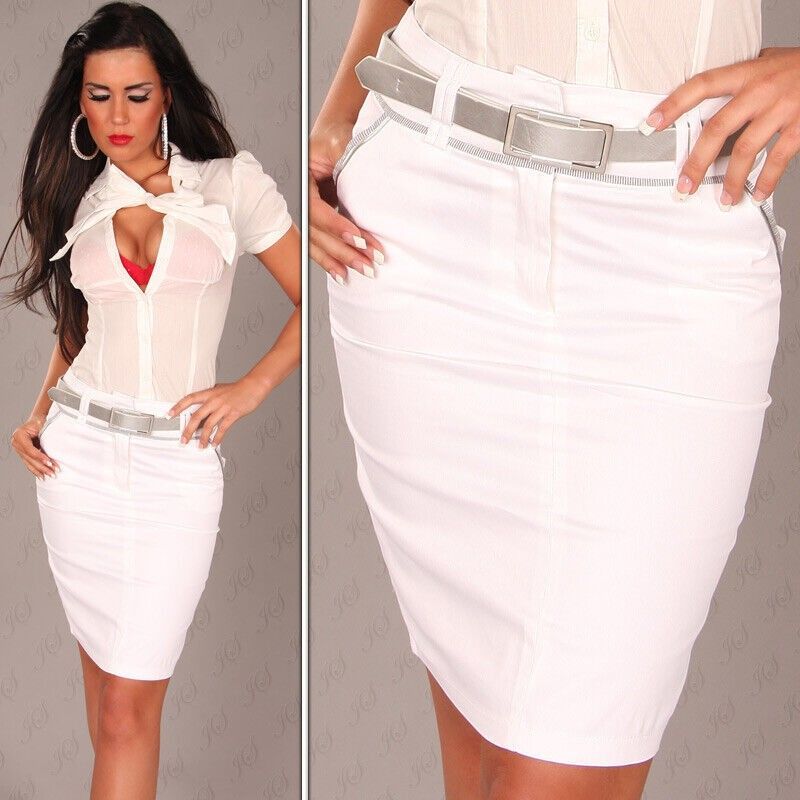 SeXy Miss Damen Business Pencil Bleistift Rock weiß Gürtel silber L 38 XL 40 Neu