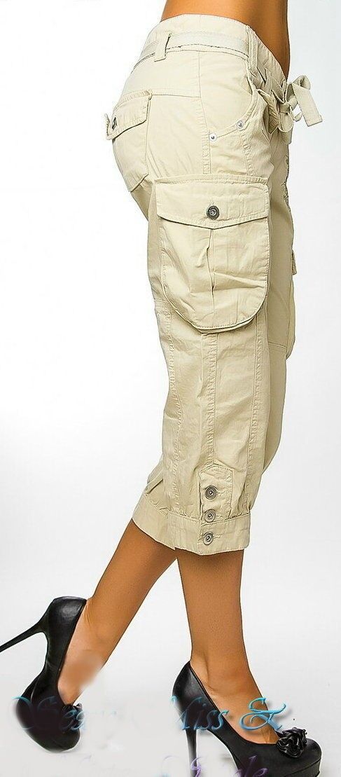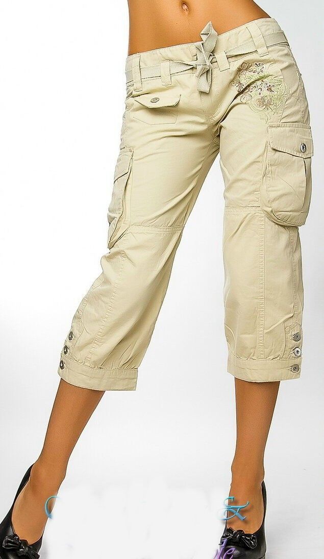 Trendstarke sommerliche Capri Cargo Hose Toller Look mit Taschen und Stickerei versehen Beinabschlüsse mit Knöpfen Gürtelschlaufen & Bindegürtel Eye Catcher Hot & Sexy In-Style Look _____________________________ Im Artikel steht Französische Größe Maße in ungedehnten Zustand locker liegend e