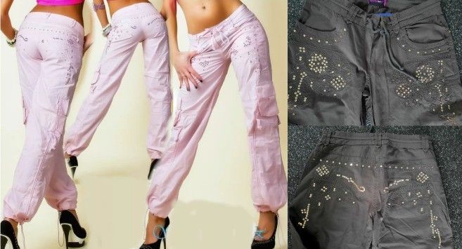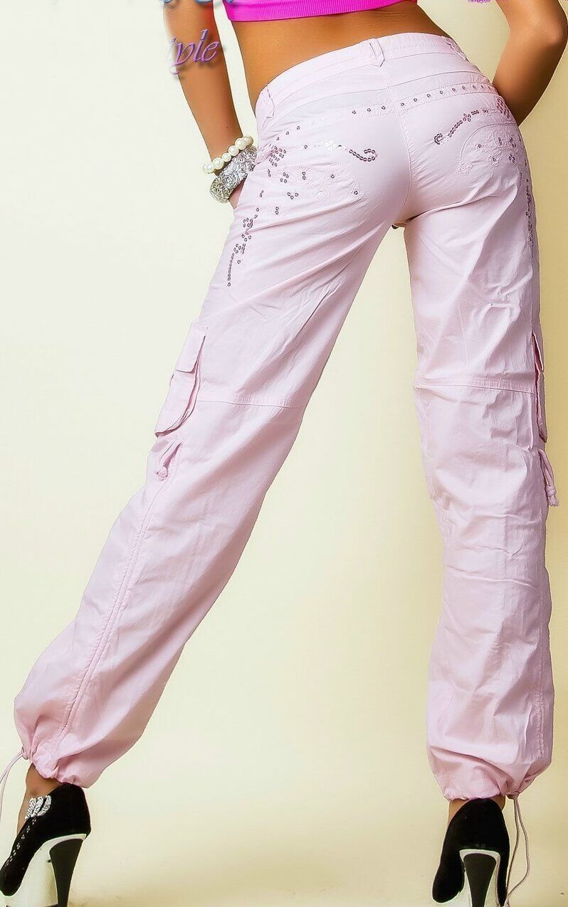 sexy Miss Damen Cargo Stoff Hose stickerei Glitzer Pailletten 34 36 38 40 rosa braun