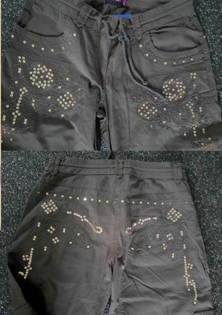 Trendstarke sommerliche Cargo Hose mit Glamour Pailletten Toller Look mit Taschen und Stickerei versehen Tunnelzug an Bund und Beinabschlüssen verkleinerbar figurbetonter Schnitt elastisches Material Eye Catcher Hot & Sexy In-Style Look _____________________________ Im Artikel steht UK Größe Maß