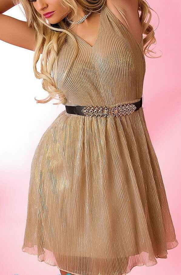 stylisches Glamour Minikleid V Dekollete vorne und hinten obere Lage in edel Gold glänzendem Chiffon Plissee Figurbetont durch Gummibund in Taillenhöhe und Gürtel figurbetonte Silouette elastisches Material Eye Catcher Hot & Sexy In-Style Look _____________________________ Im Artikel steht Franz