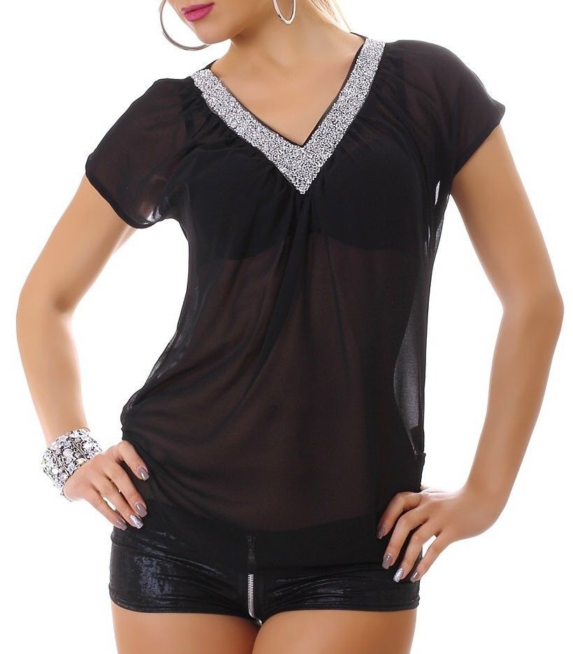 Sexy Miss Damen Chiffon V Top Bluse transparent S 34 M 36 L 38 silber Diamant schwarz