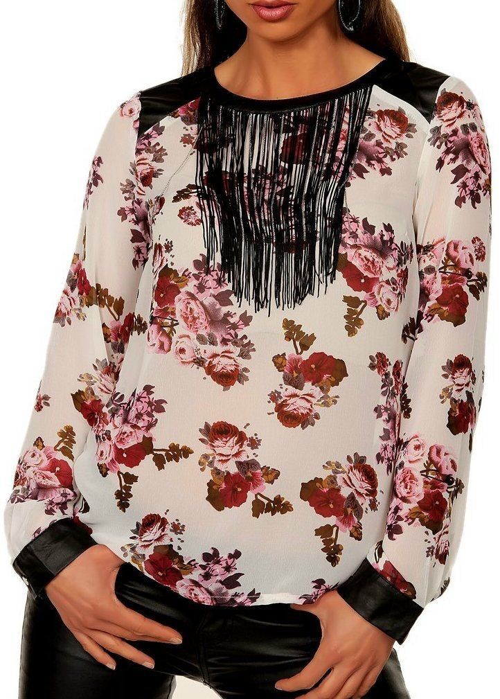 SeXy MiSS Damen Flower Bluse Top Chiffon Fransen Look S 34 M 36 L 38 Bunt weiß