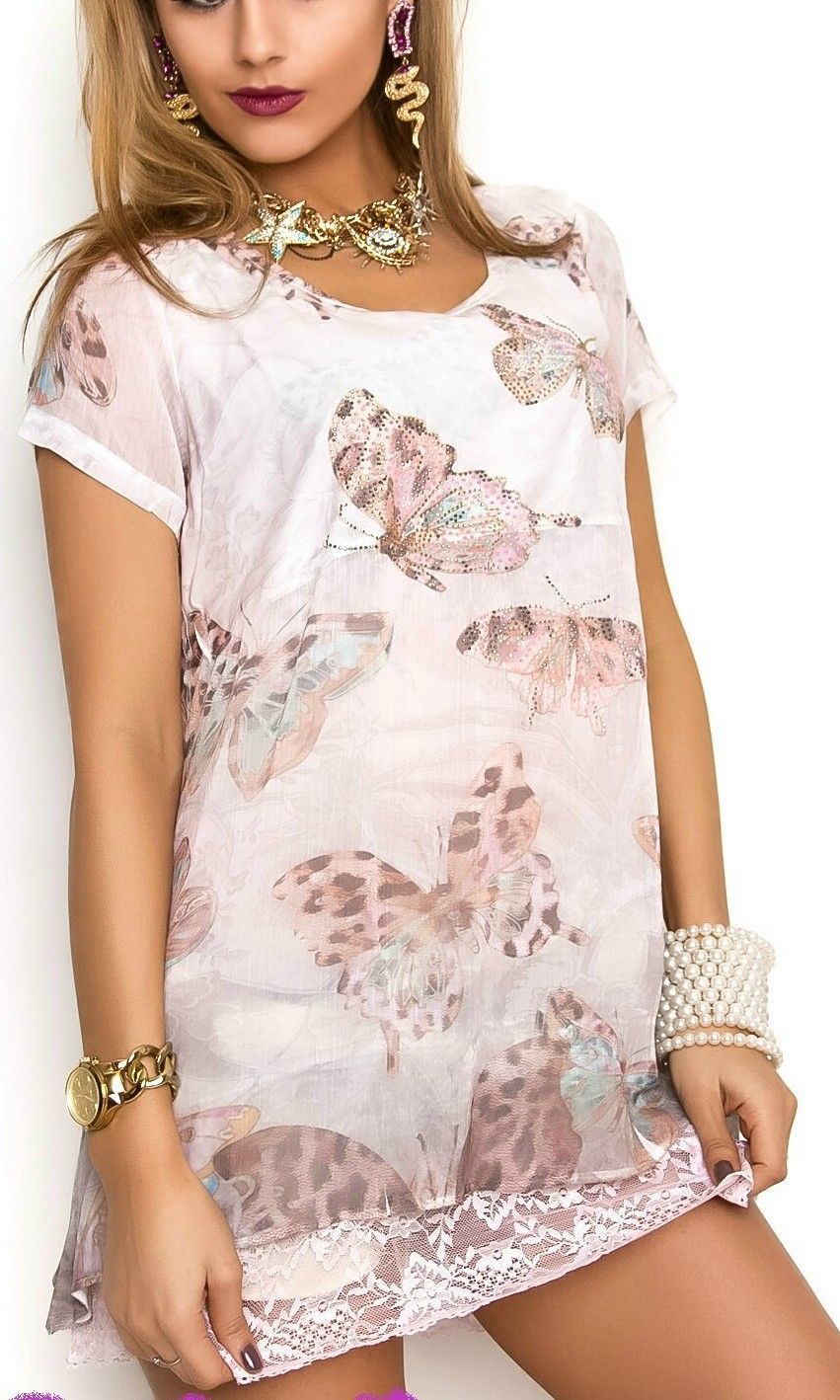 Stylisches 2 Lagen Tunika Top Longshirt Rundhals Ausschnitt Schmetterling Motiv und Retro Falten Print Glitzer Strass, Spitzenborde lässiger Schnitt Eye Catcher Hot & Sexy In-Style Look _____________________________ Im Artikel steht Französische Größe Maße in ungedehnten Zustand locker liegend e