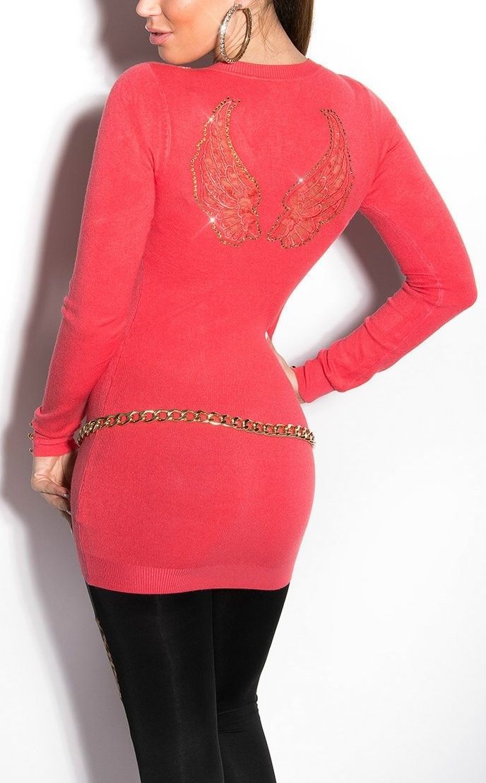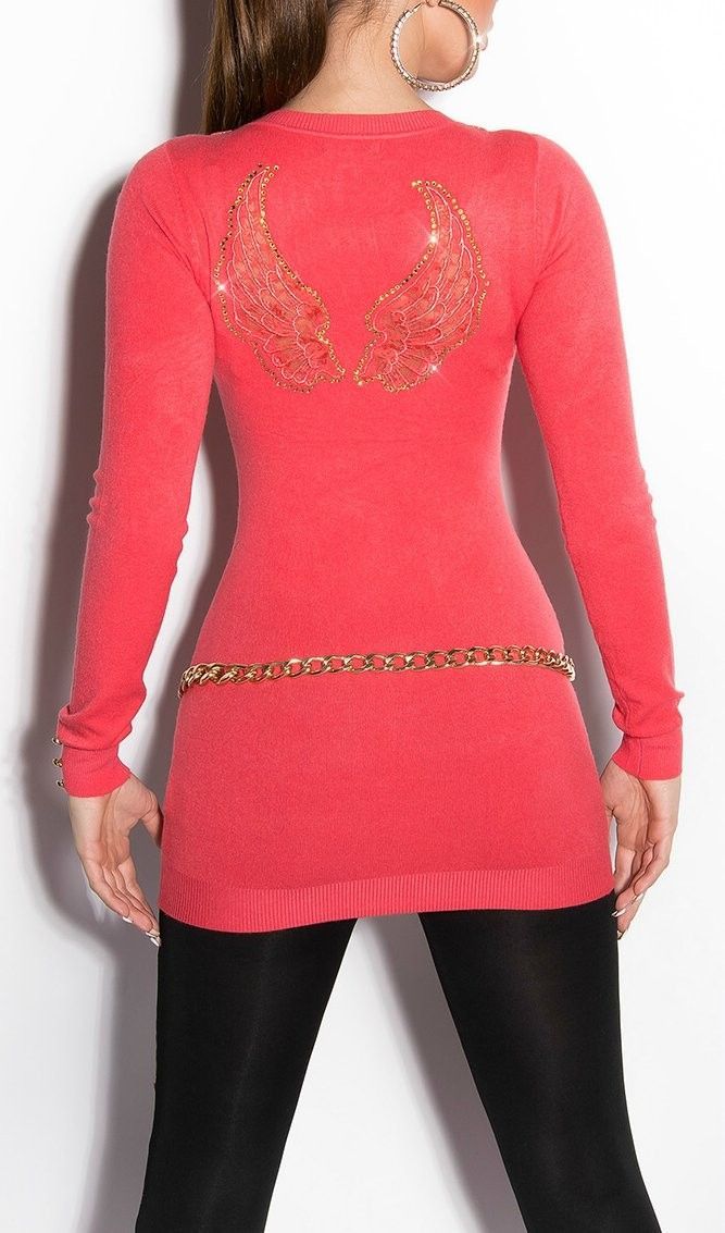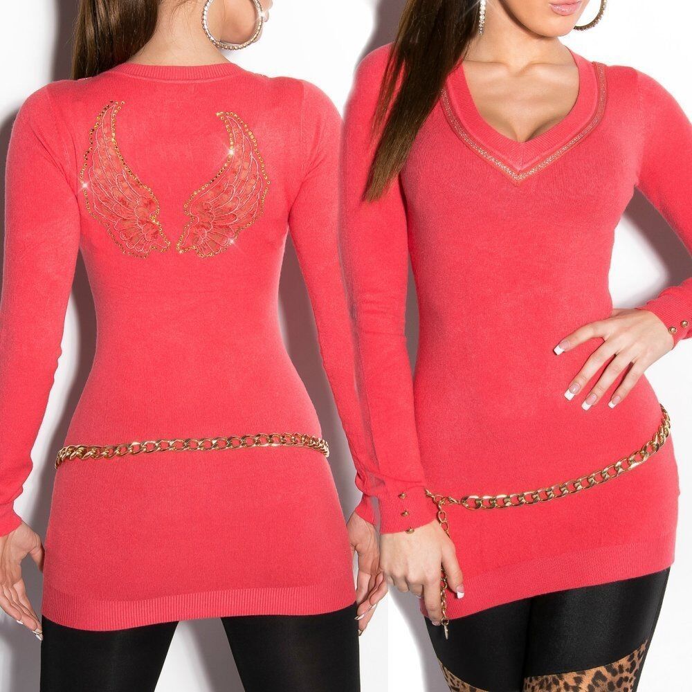 SeXy Miss Damen Girly Pullover Long Pulli Flügel Feinstrick Spitze Strass XS/ S coral