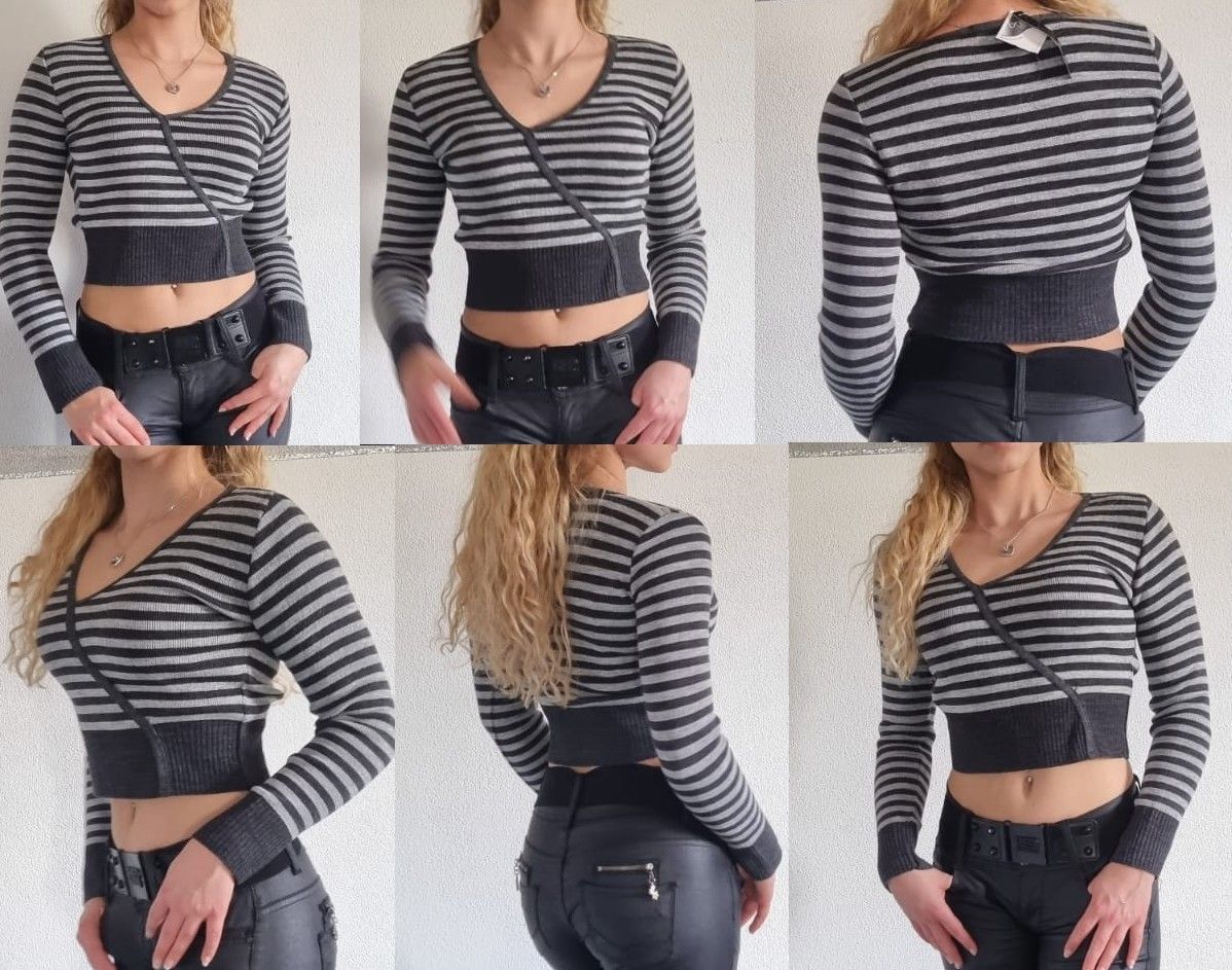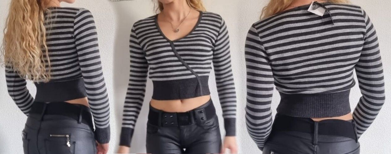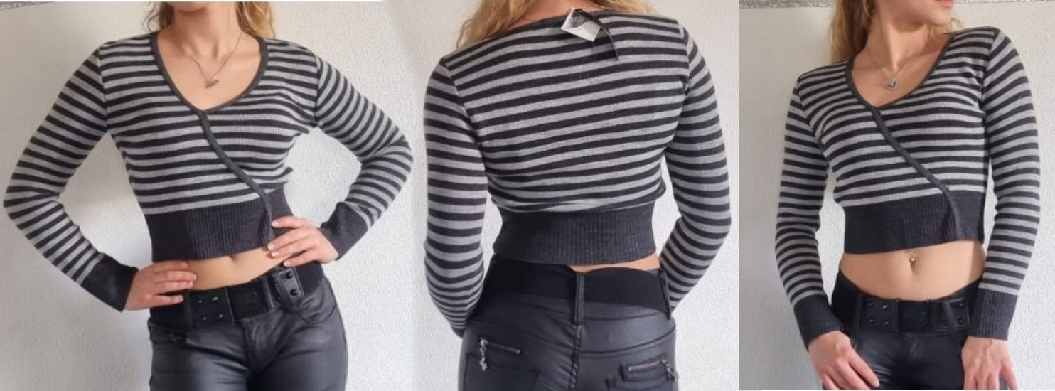 Glamour Strick-Pulli Ausschnitt in V-Form bauchfreier Kurz Pulli Streifen mit eingewebtem Glitzer Lurex figurbetont tailliert Eye Catcher Hot & Sexy In-Style Look _____________________________ Einheitsgröße - Uni - Ohne Größe Maße in ungedehnten Zustand locker liegend einfache Weite in cm Tolera