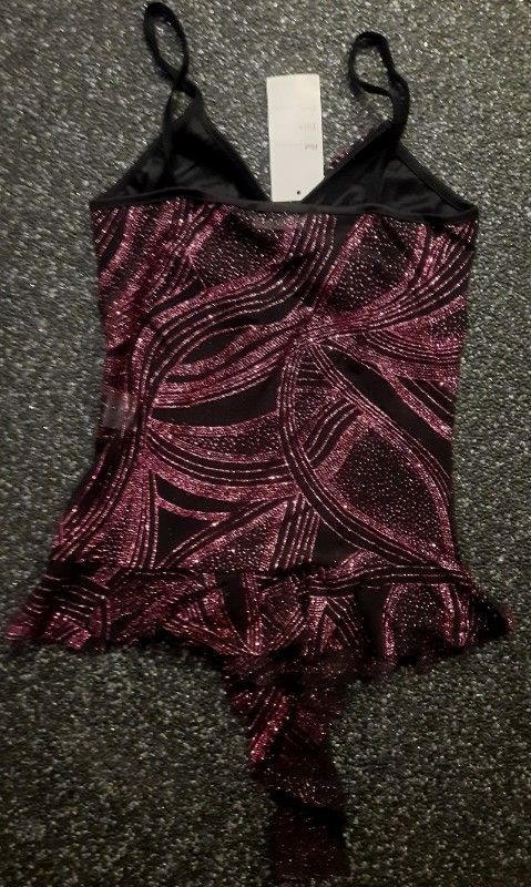 Glamour Träger Top Volant Borde Blüte Volantbänder Raff V Ausschnitt Metallic Glitter Print figurbetonter Schnitt Eye Catcher Hot & Sexy In-Style Look _____________________________ Einheitsgröße - Uni - Ohne Größe Maße in ungedehnten Zustand locker liegend einfache Weite in cm Toleranz + - 2 cm