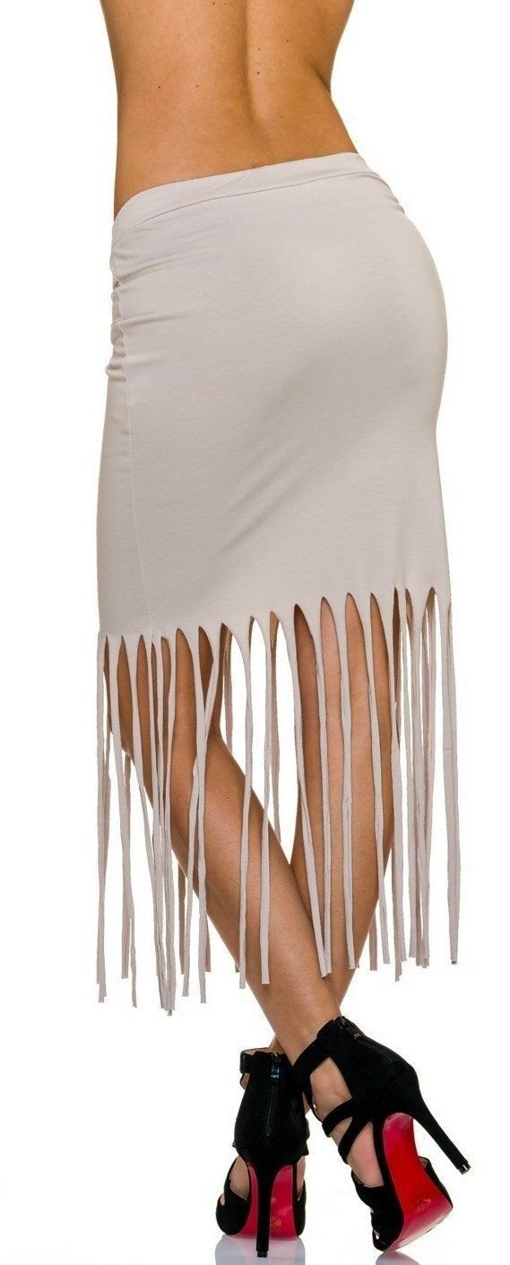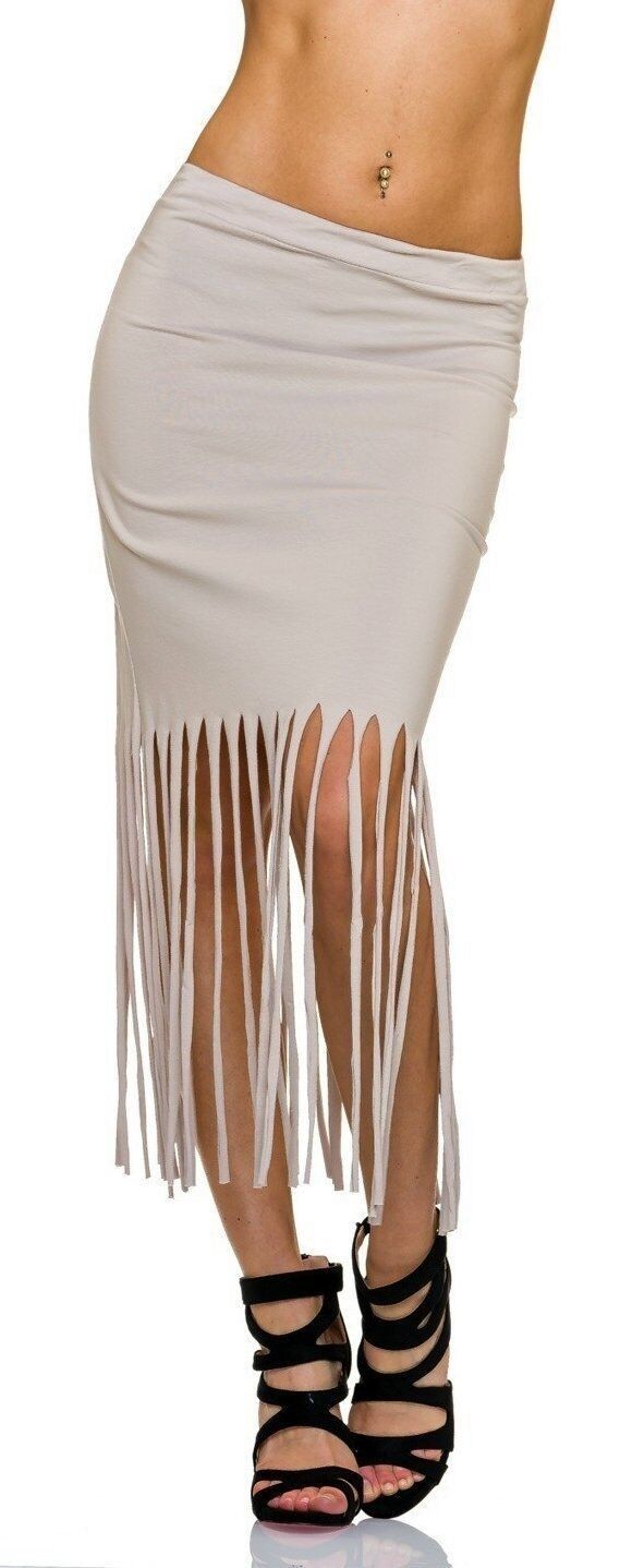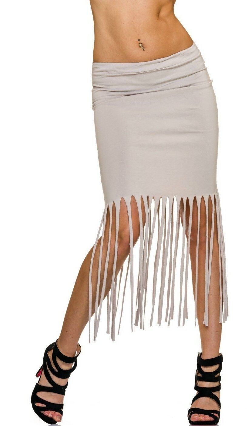 SeXy Miss Damen Girly Trend Midi Pencil Schlitze Fransen Hüft Rock 34/36/38 beige