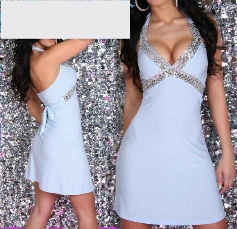SeXy MiSS Damen Glamour Pailletten Neck Mini Kleid babyblau silber 34/36/38 NEU TOP