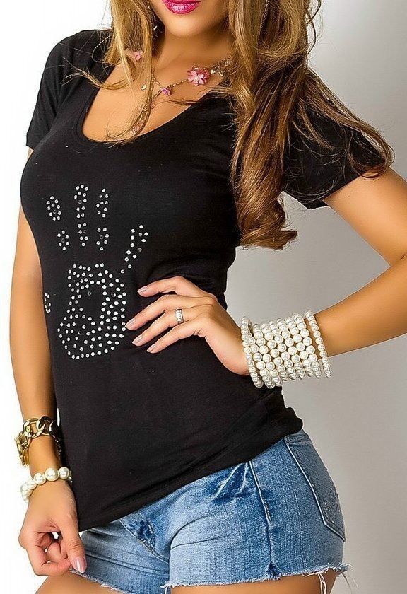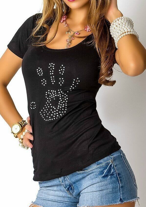 Sexy MiSS Damen Glamour Shirt Strass Hand Top M/ L 36/38 schwarz NEU