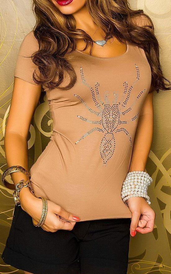 Sexy MiSS Damen Glamour Shirt Strass Spinne Top S/ M 34/36 M/ L 36/38 braun NEU