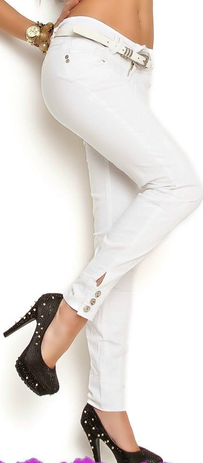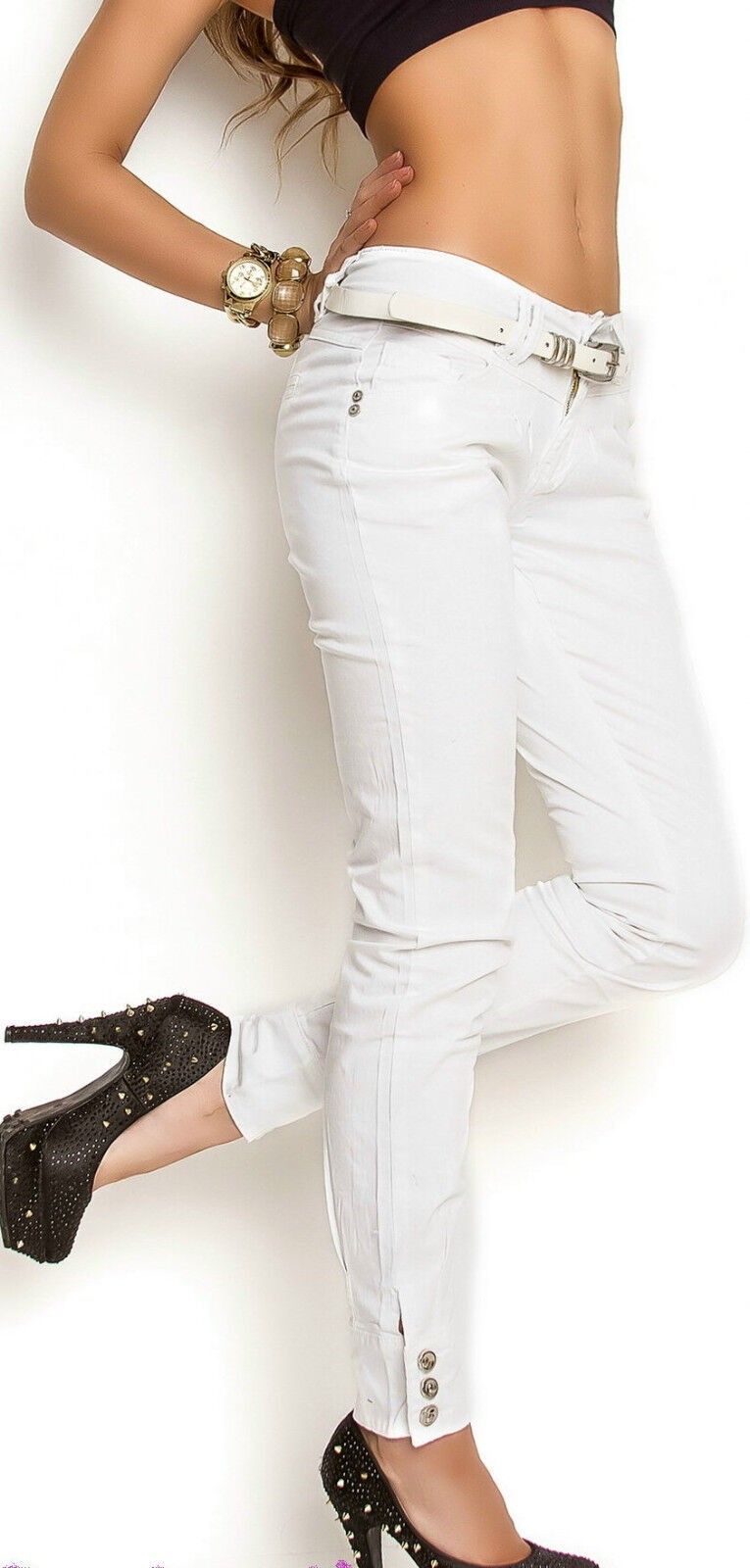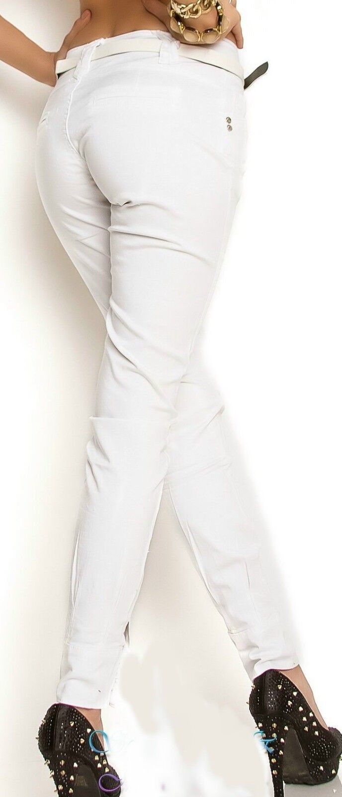 SeXy Miss Damen Hüft Jeans Pump Hose Low cut Falten Gürtel 36 38 40 M L XL weiß