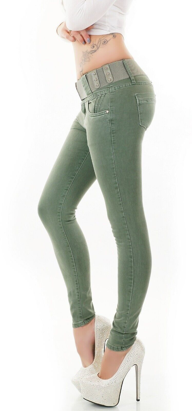 SeXy Miss Damen Hüft Jeans Stretch Röhre Hose Skinny Gürtel 32 34 36 38 40 grün