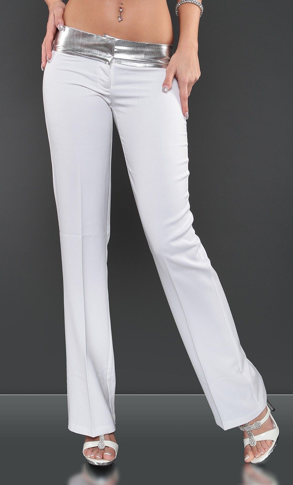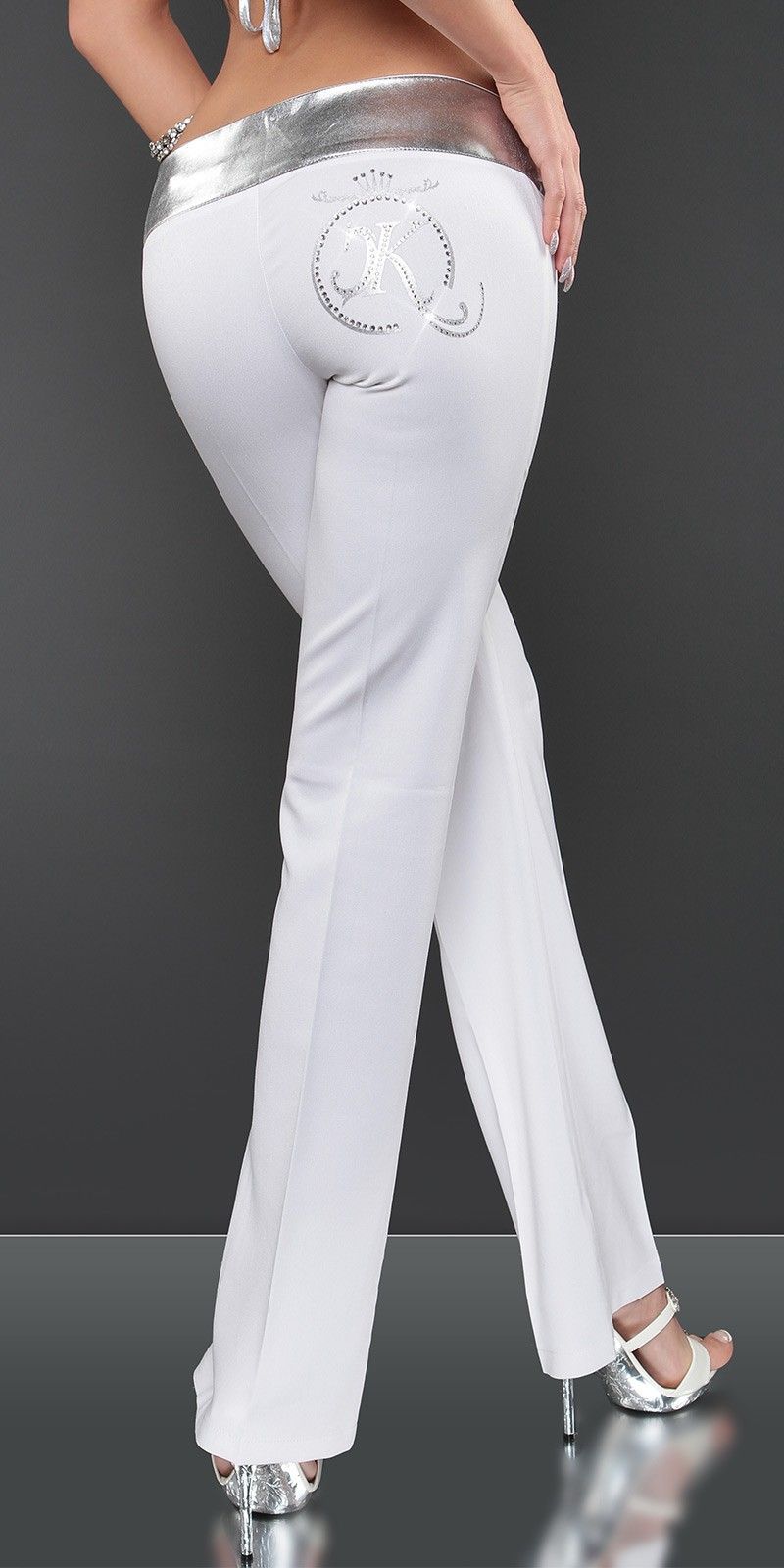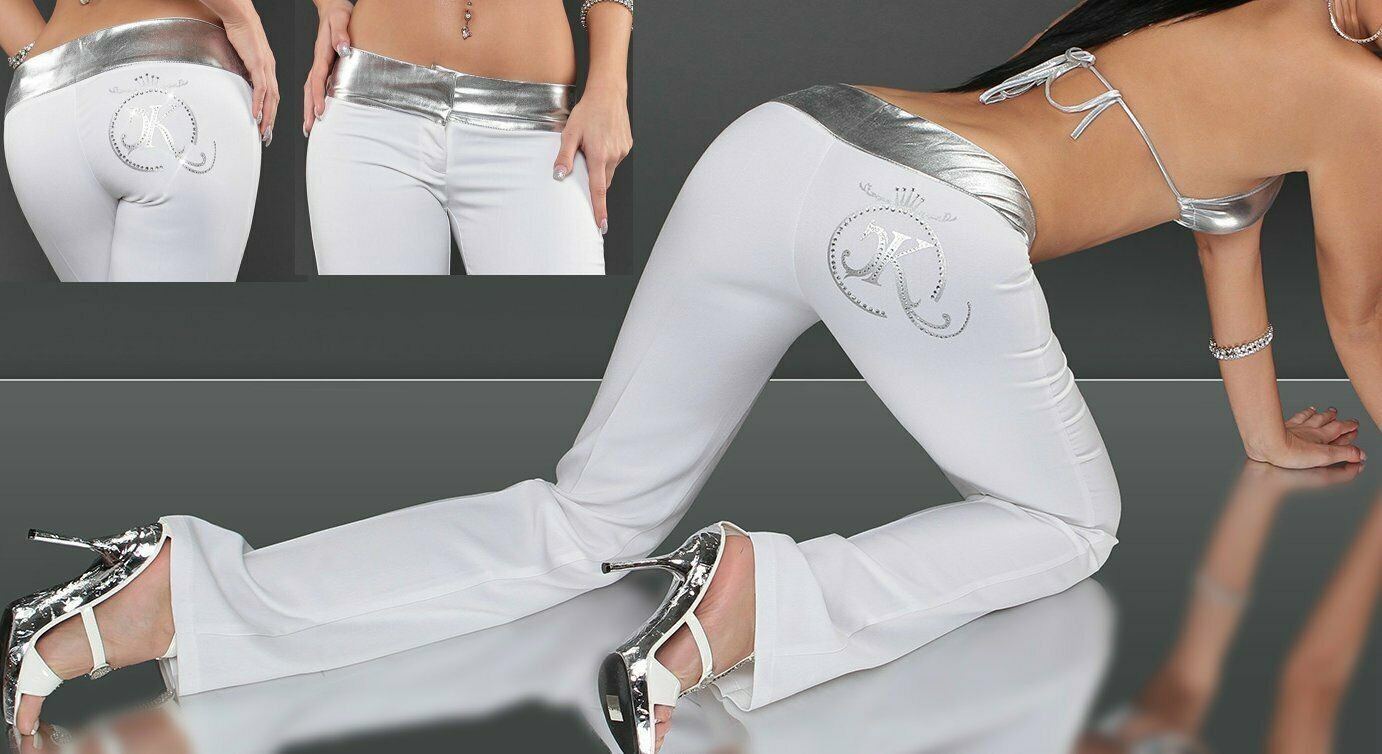 SeXy Miss Damen Hüft Stoff Hose LoW CuT Print Strass 34 36 38 40 weiß silber Neu