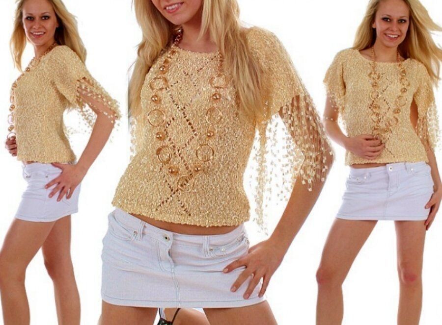 SeXy MiSS Damen Loch Strick Pulli Fetzen Kurz Arm Pullover beige 34/36/38 NEU