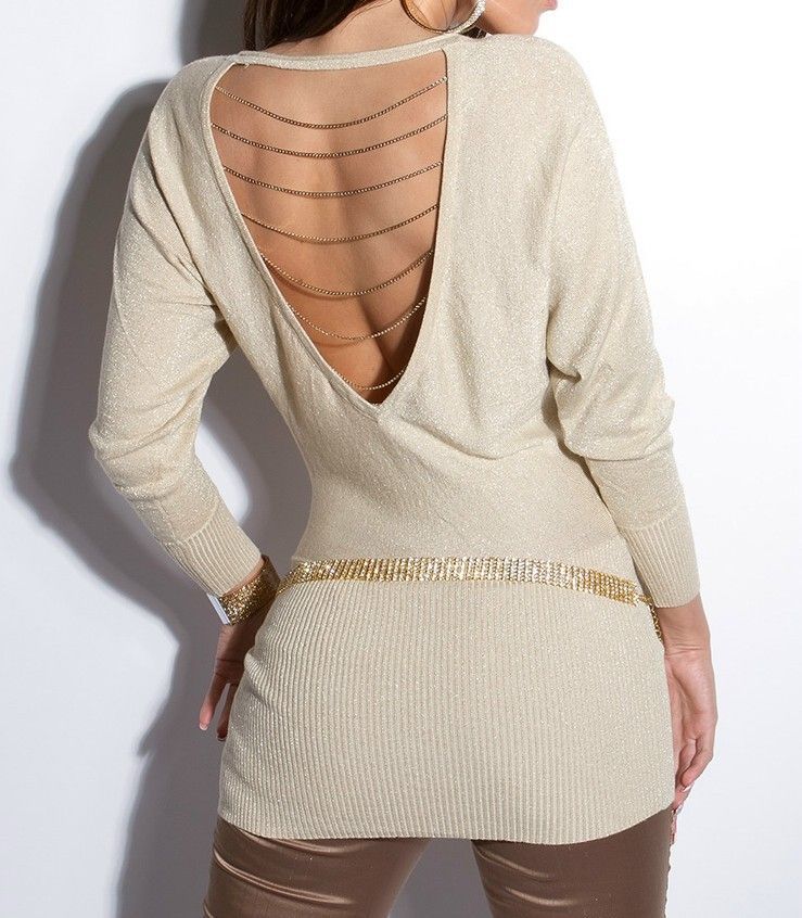 Edel Look Langarm Long Pulli Feinstrick Pullover Glamourös eingewebter Glitzer Lurex mega sexy Rückenausschnitt mit goldener Kette verziert vorne runder Ausschnitt figurbetonter Schnitt elastisches Material Eye Catcher Pur Hot & Sexy In-Style Look _____________________________ Einheitsgröße - Un