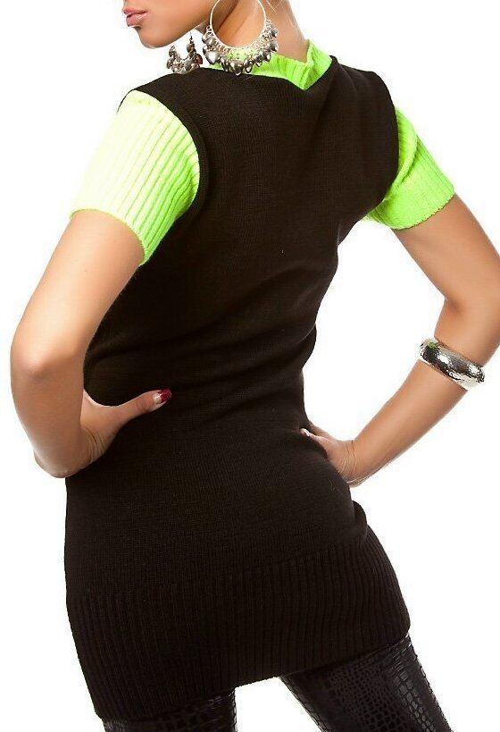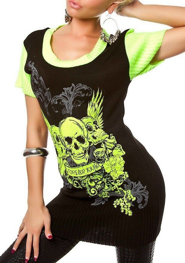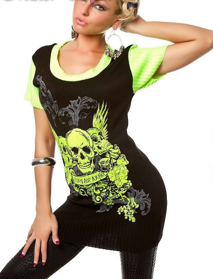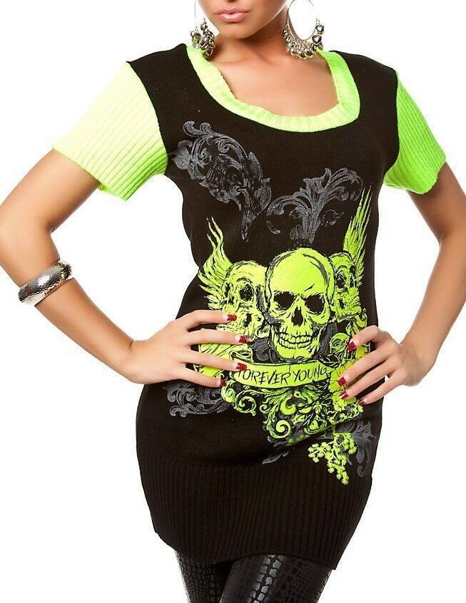 Sexy Miss Damen Long Pulli Strick Pullover Skull 34/36/38 schwarz neon gelb