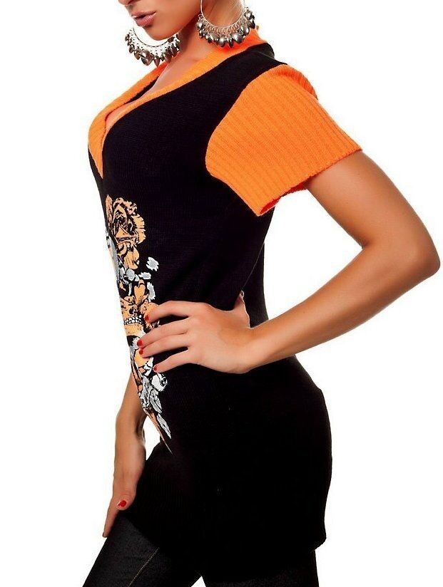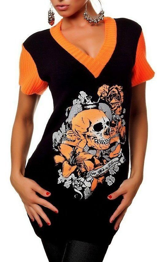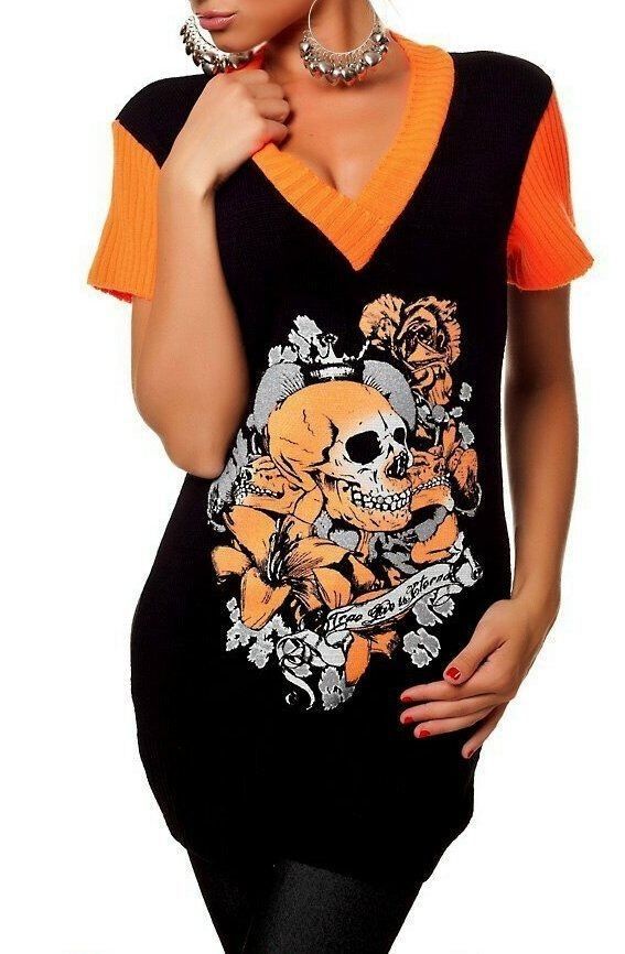 Sexy Miss Damen Long V Pulli Strick Pullover Skull 34/36/38 schwarz neon orange