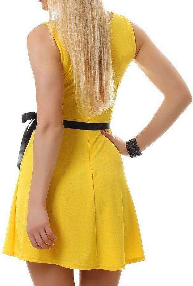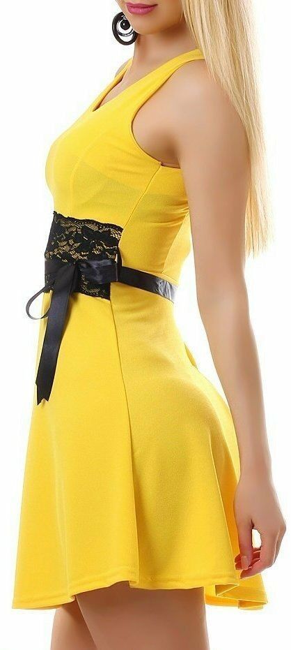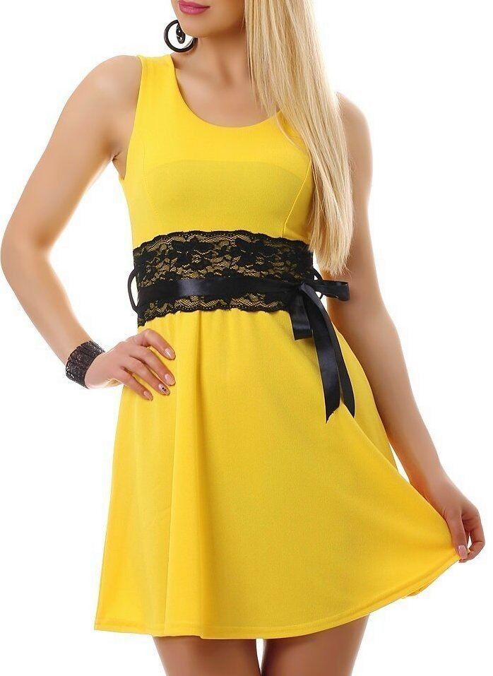 SeXy Miss Damen Mini Kleid Spitze Bindeband Borde Schwarz Sommer Dress 32/34/36 gelb