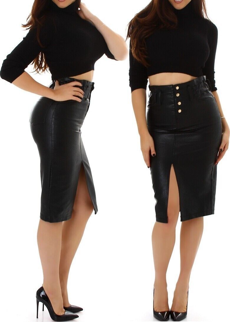 Leder Look Pencil Midi Rock Knielanger Highwaist-Rock dünnes Stretch-Material glatte Kunstleder-Oberfläche Bleistift-Schnitt hoher Gehschlitz Zier-Taschen vorne hinten Eingrifftaschen Taillenbund mit Falteneffekt tiefer gesetzte Gürtelschlaufen auffällige Druck-Knopfleiste figurbetonter eng anliegen