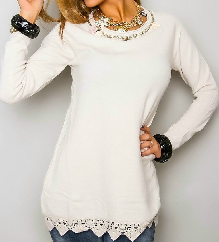 Pulli Glamour Shirt lange Ärmel Rundhalsausschnitt mit Perlen Ketten Style und Applikationen in Flowerlook verziert Abschlußbund mit Zackigem Spitzenborden Abschluss leicht ausgestellte Tunika A Form wird nach unten breiter elastisches Material Eye Catcher Hot & Sexy In-Style Look ______________