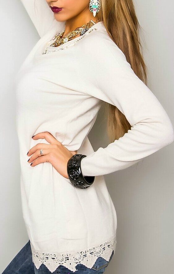 Sexy Miss Damen Pulli Strass Perlen Spitze Pullover S/ M 34/36 M/ L 36/38 creme