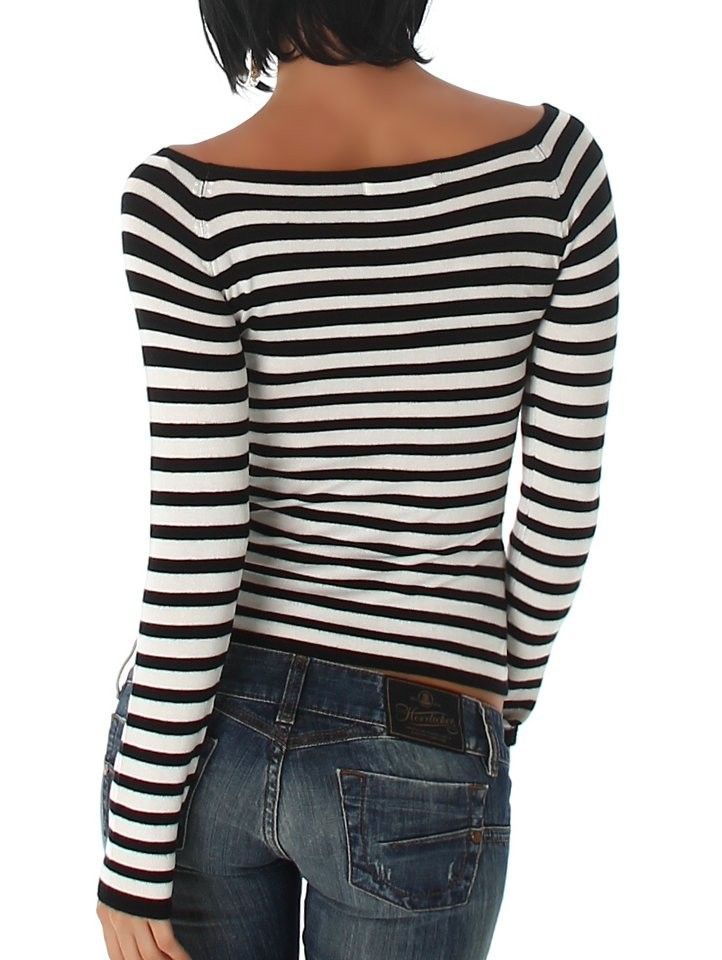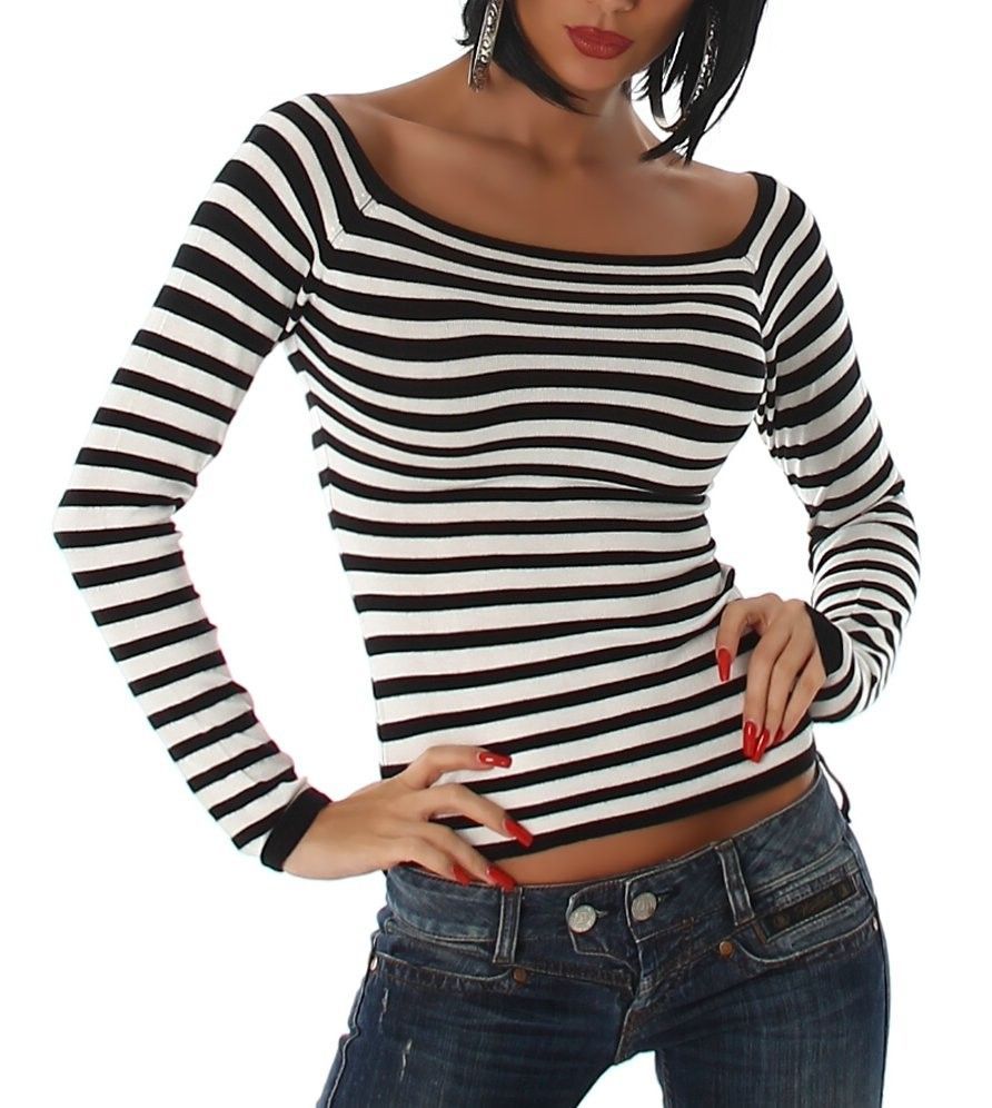 auffälliger Fein Strick-Pulli mit stylischem Ringel Look als breiter Rundhals oder über die Schulter gezogen als Carmenausschnitt tragbar kurz geschnitten leichter dünner Pulli figurbetont tailliert elastisches Material Eye Catcher Hot & Sexy In-Style Look _____________________________ Einheitsg