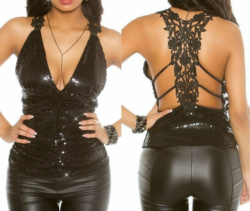 SeXy Miss Damen Raff V Top Häkel Spitze Rücken Pailletten XS/ S schwarz Neu