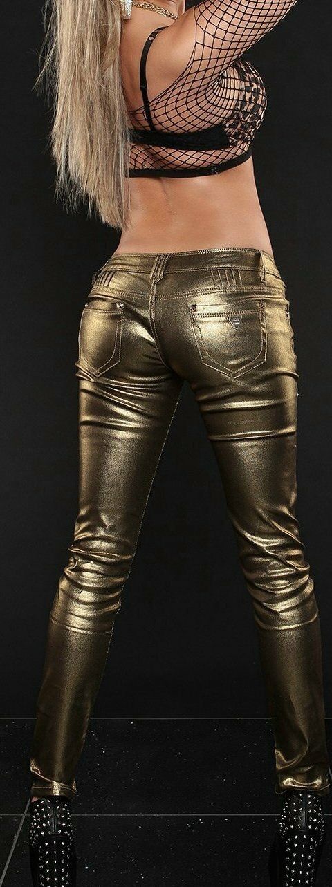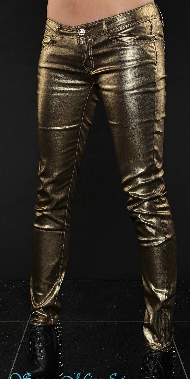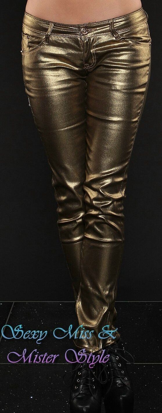 SeXy Miss Damen Röhre Hüft Jeans Hose glänzig schimmernd 34 36 38 Alt-Gold