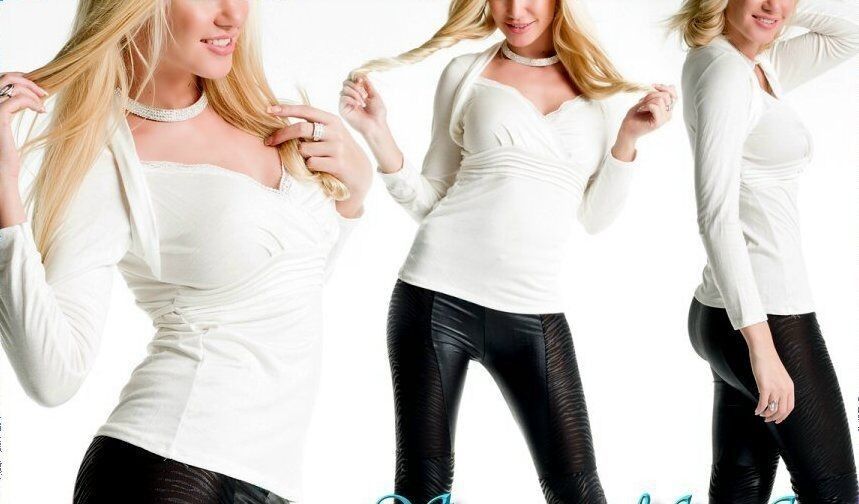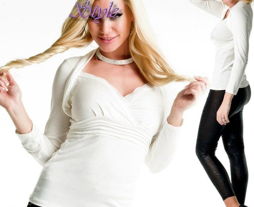 SeXy Miss Damen Shirt Langarm Bolero Look Top V Dekollete Spitze 34/36/38 Creme