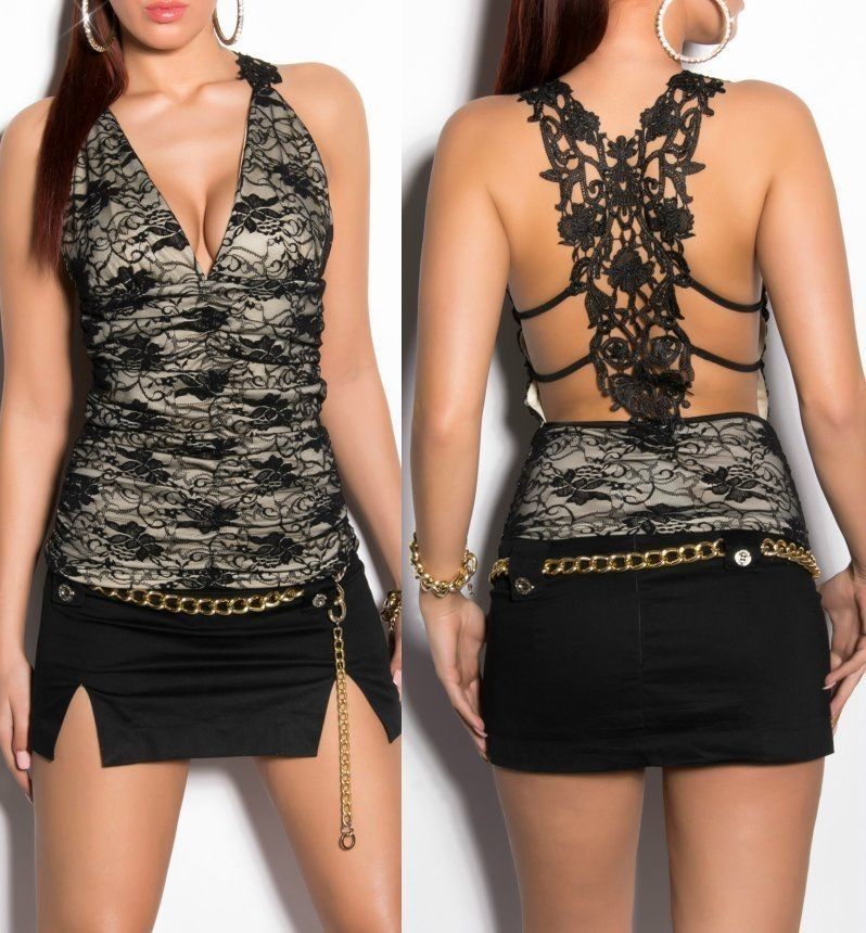 stylisch gerafftes Oberteil heißes Design mit Blickdicht unterlegtes Spitzen Oberteil sehr tiefem Ausschnitt näckisch offener Rücken stylische Spitzen-Stickerei edler Style in figurbetonter Silhouette elastisches Material Eye Catcher Pur Hot & Sexy In-Style Look _____________________________ Ein