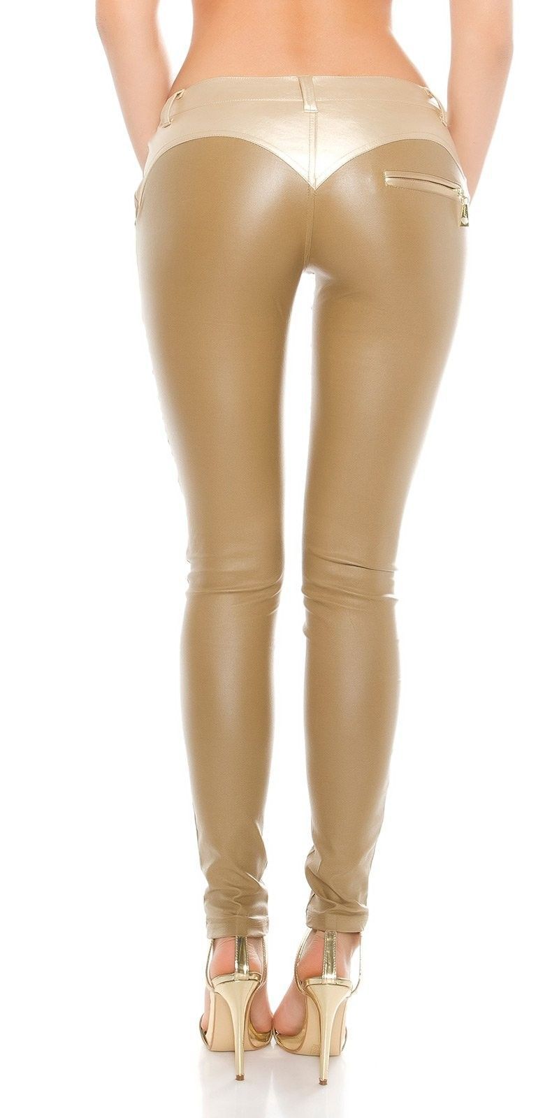 Trendige Push up Po Hose Baumwoll-Stretch mit glänzender Kunstleder-Optik modischer Röhren-Form Eingrifftaschen vorne hinten Zier-Zipper-Tasche Farblich abgesetzter Hüftbund im Metallic-Effekt Knopf und Reißverschluss figurbetonte Silhouette Eye Catcher Hot & Sey In-Style Look __________________