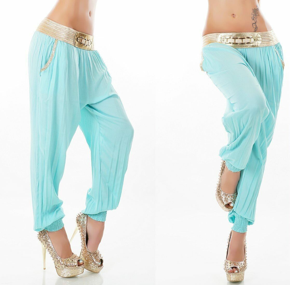 Sexy Miss Damen Trend Harems Pluder Aladin Sarouel Hose gold Bund blau 34/36/38
