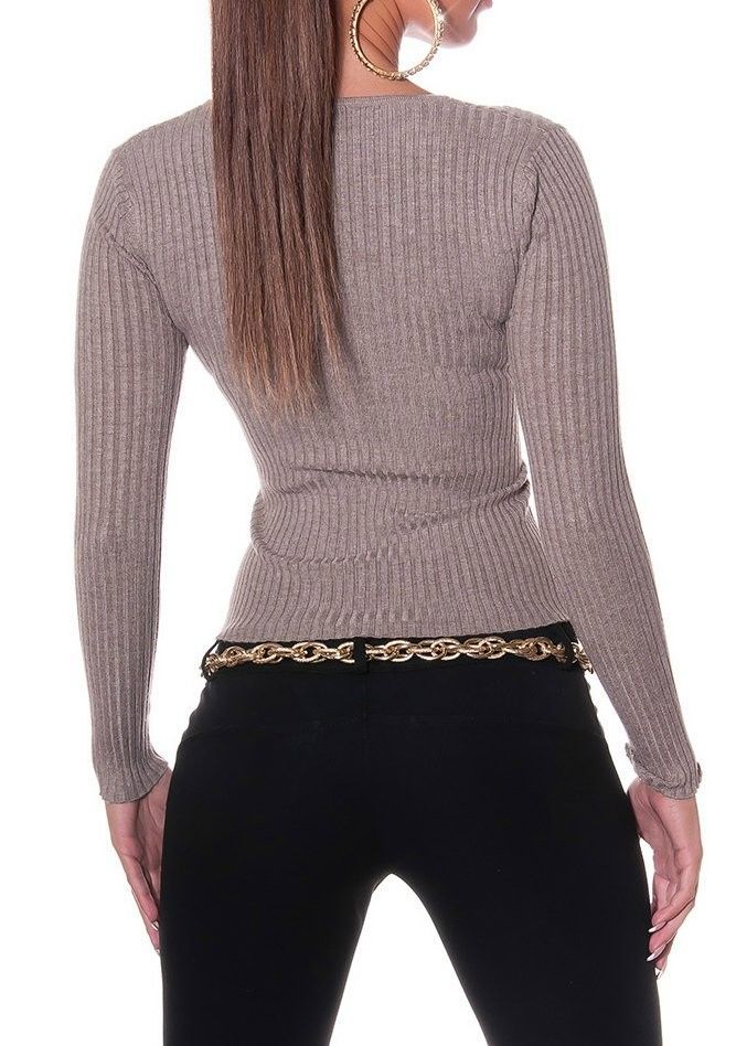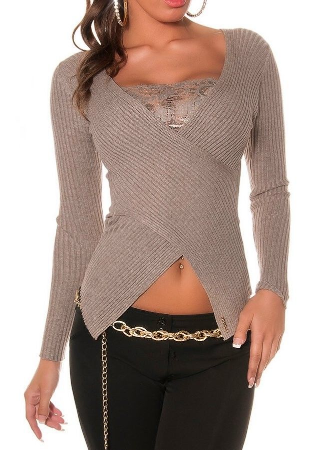 langärmliger Strick Pulli aus eng anliegendem Rippstrick Doppellagig verarbeitet obere Lage im Wickellook mit tiefer V-Dekollete und bauchfreiem asymmetrischem Look untere Lage im Ausschnittbereich aus Bandeau Style Spitzenstoff sehr figurbetont tailliert elastisches Material Eye Catcher Pur Hot &am