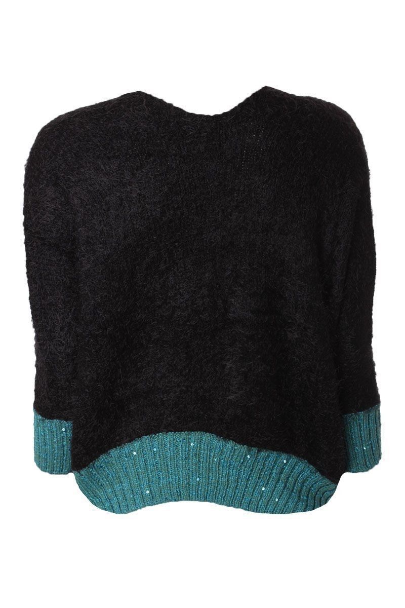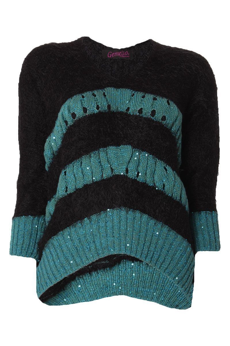 Damen Pulli flauschig weich in Streifen Design petrol Damen Pullover kurzer Schnitt mit 3 4 Fledermausärmel. Flauschpulli V-Ausschnitt Streifen und Ärmelabschlüsse mit Pailletten Verzierung. Pullover im Oversize Style. Loose fit, locker geschnitten. elastisches Material Eye Catcher Hot & Sexy In