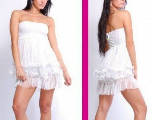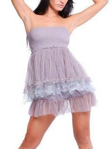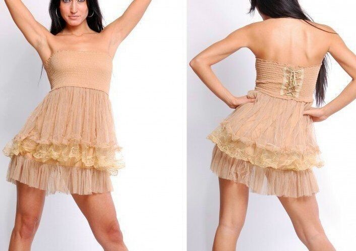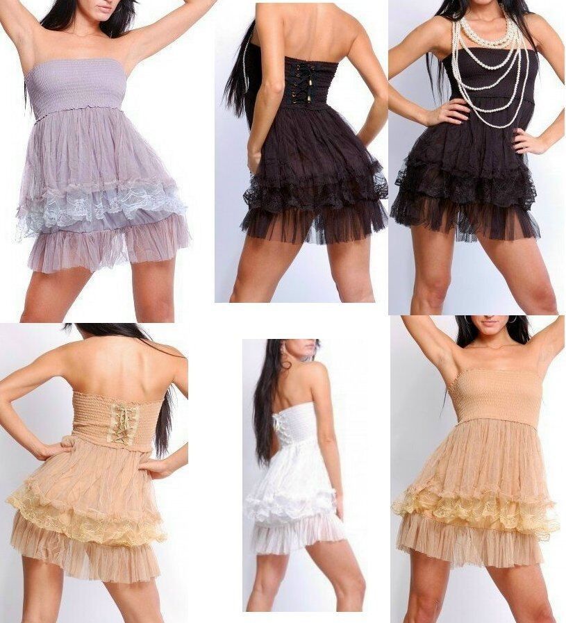 sexy auffälliges Mini Dress mehrstufiges Volant Kleid stylischer romanic Look aus Tüll und Spitze der Brustbereich gesmokt verarbeitet für perfekten Sitz und mit Corsagenbindung versehen (kann vorn oder hinten getragen werden) abnehmbare Träger im Rücken mit Häkchen figurbetonte Silouette elastische