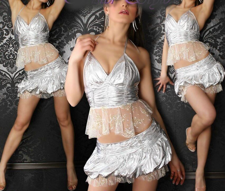 SeXy Miss Gogo metallic Lack Lk Strass Spitze 2 Teiler Mini Rock Top XS-S silber