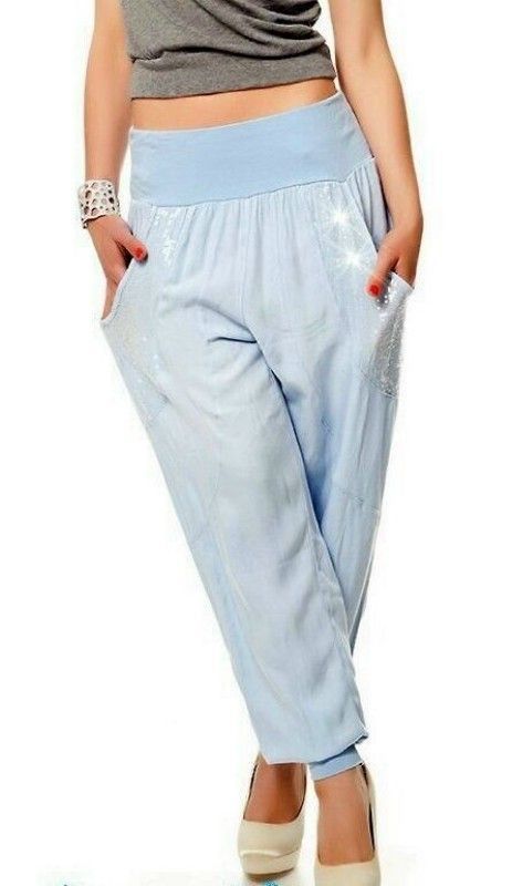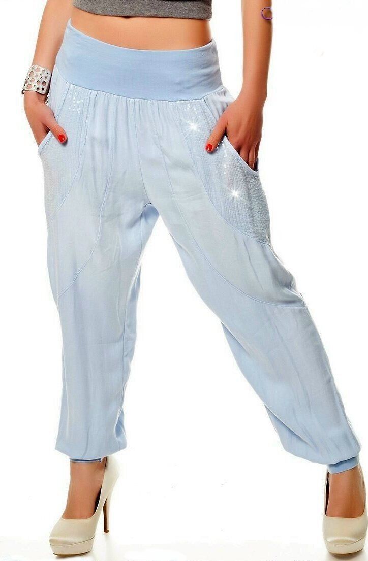 Trendstyle sommer Hüfthose Haremshose mit elastischem breitem Bund Faltiger Style super stylischer sommerlich luftig leichter Schnitt 2 Eingrifftaschen Glamourös mit Ton in Ton Pailletten Beinabschlüsse in Pumpform figurbetonter Schnitt elastisches Material Eye Catcher Hot & Sexy In-Style Look _