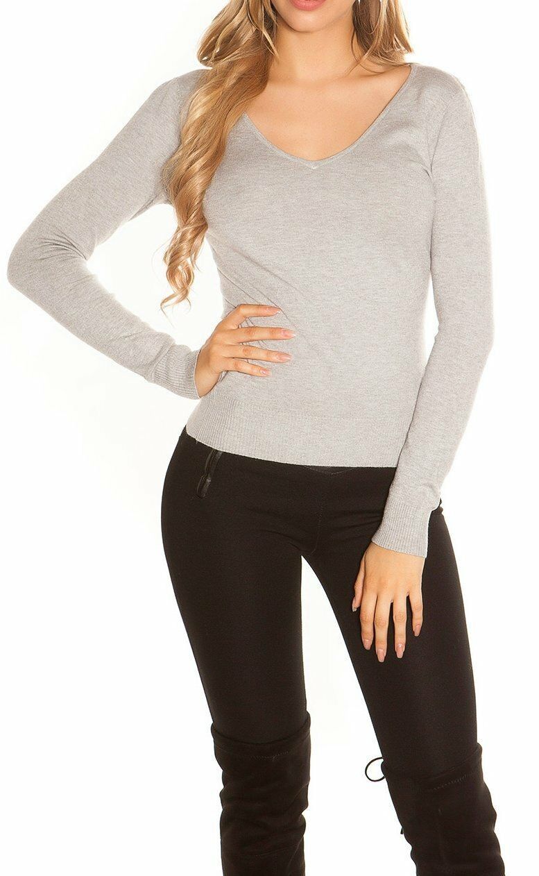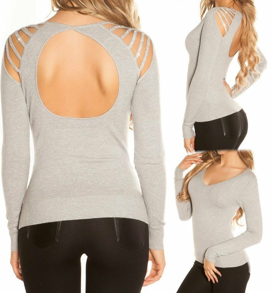 SeXy Miss V Pullover Strass Rücken Look Damen Girly Feinstrick Pulli 34/36/38 grau