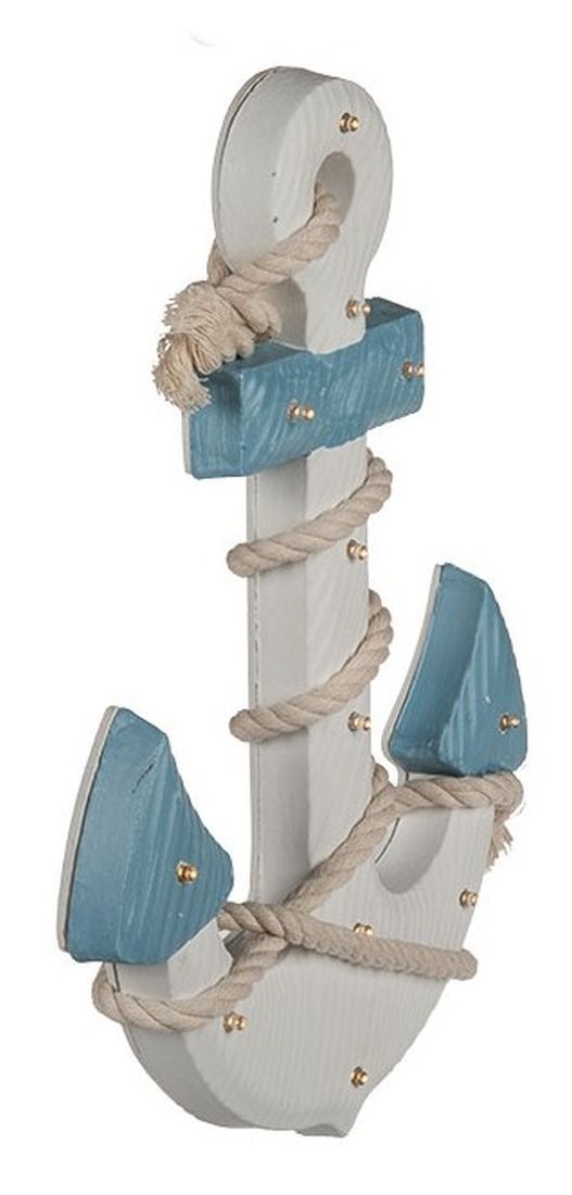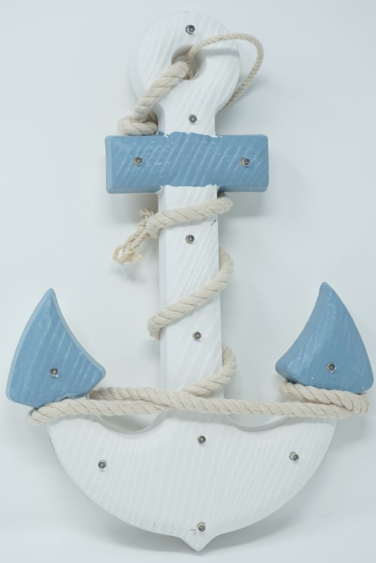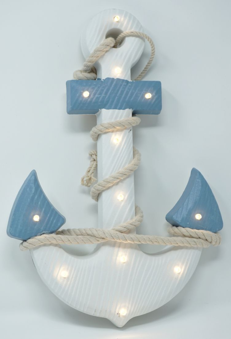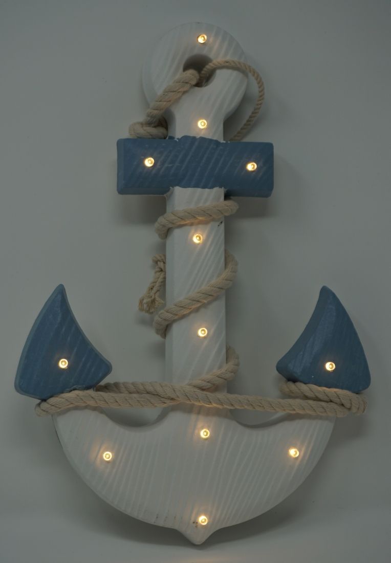 Shabby Dekoration Holzanker blau/weiss mit Seil LED Beleuchtung 12 LEDs Anker