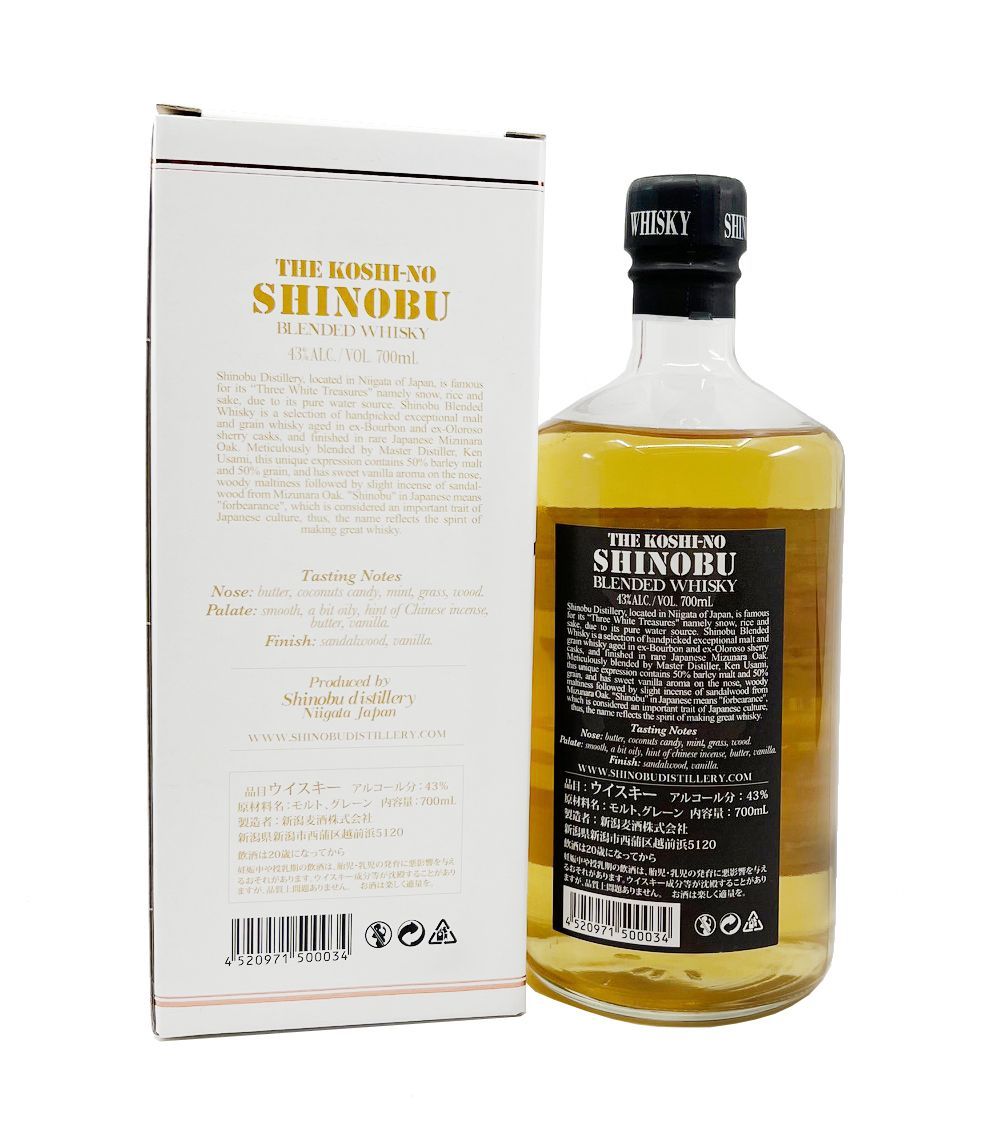 Shinobu Blended Whisky 0,7l 43%vol. Shinobu - japanischer - Blended Whisky 0,7l 43%vol. Der Shinobu Blended Whisky wird in Niigata hergestellt. Niigata ist eine der größten Hafenstädte Japans. Sie liegt an der Mündung des Flusses Shinano. Das Wort 'Shinobu' Bedeutet auf Japanisch so viel wie 'Nachsi