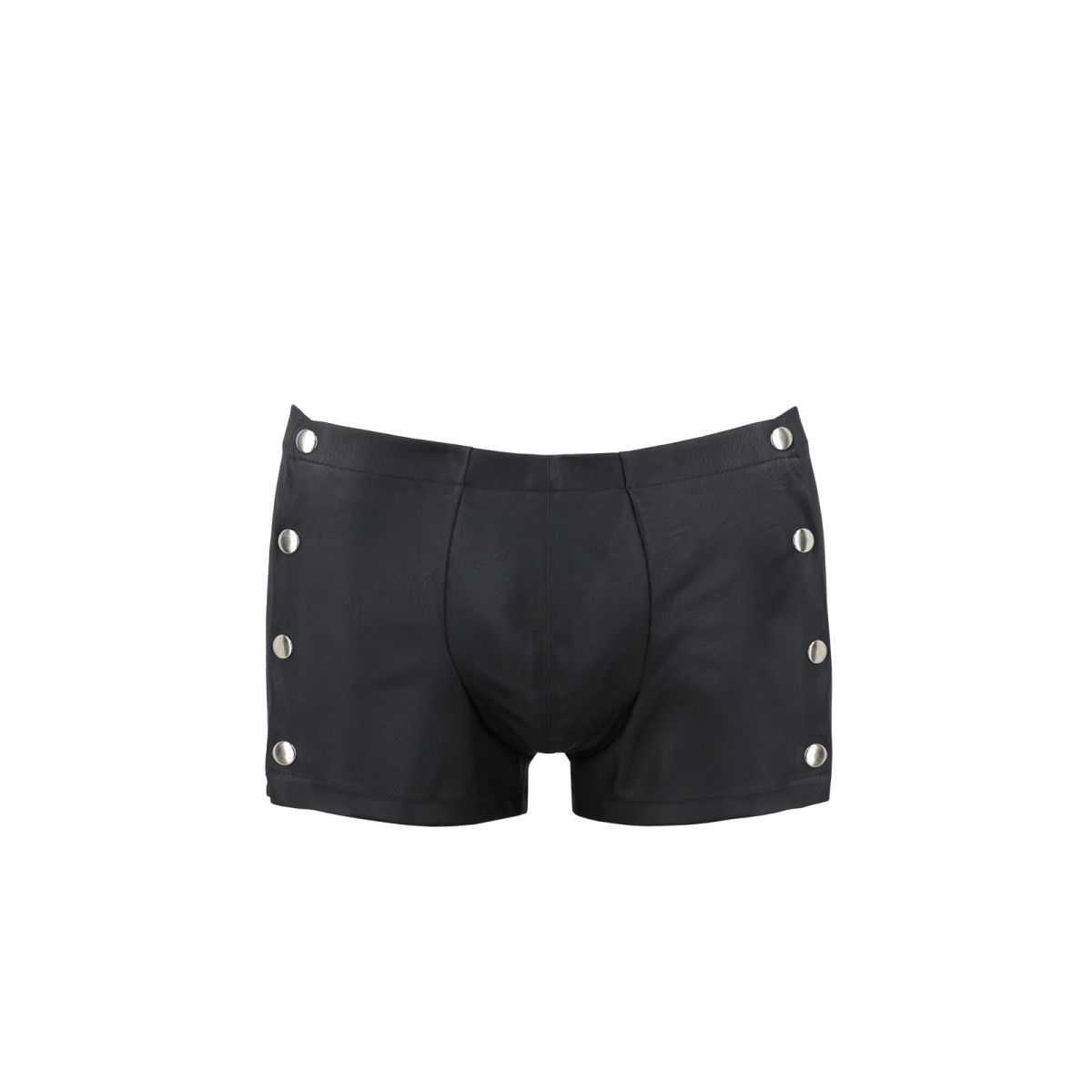 Shorts sind aus schwarzem, lederartigem Material gefertigt und mit Druckknöpfen