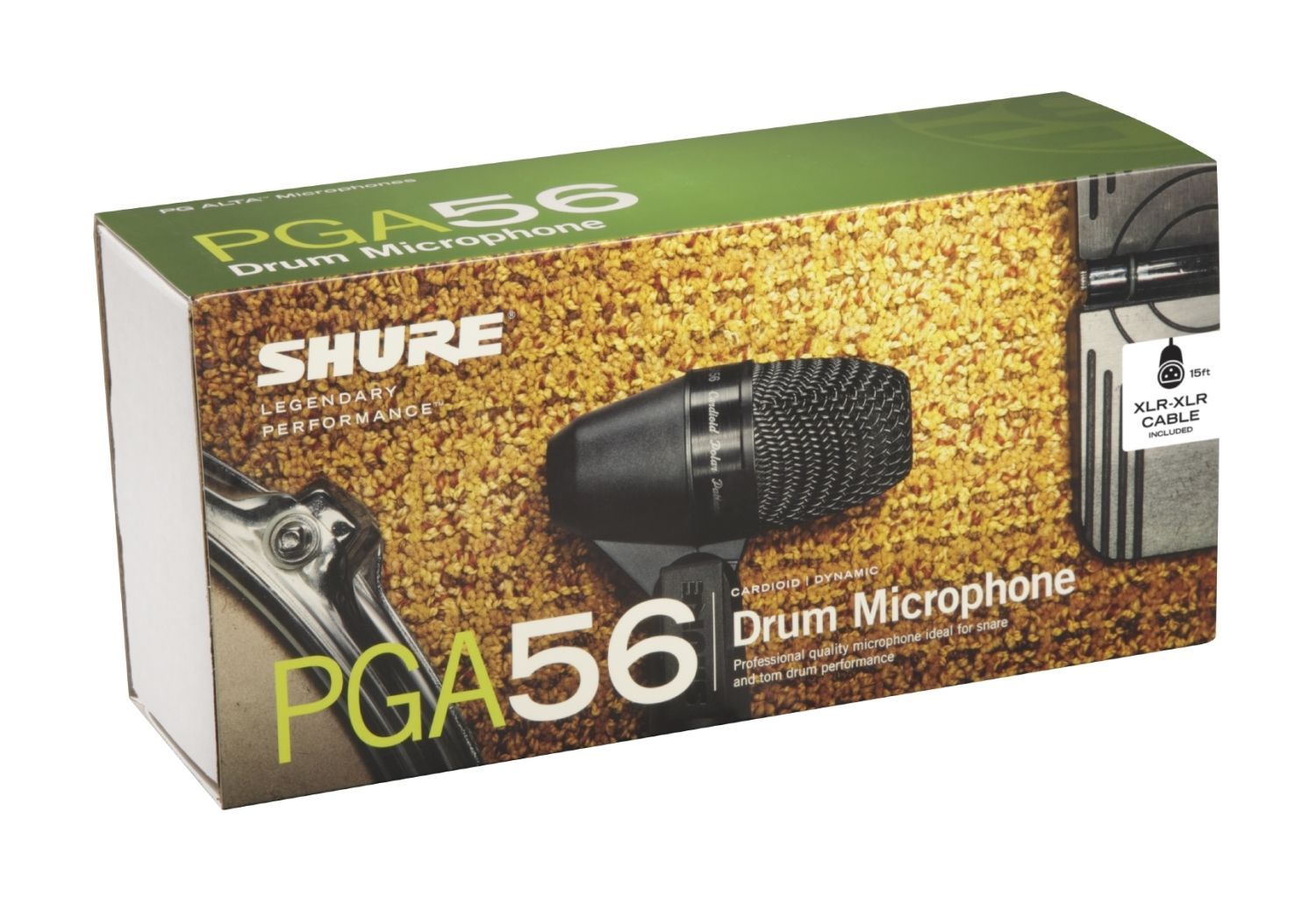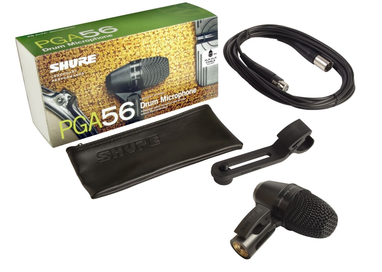 Shure PGA56 für Snare, Toms, Percussion Richtchharakteristik: Niere Frequenzbereich: 50 - 15.000 Hz Impedanz: 200 Ohm Empfindlichkeit bei 1 kHz: -57 dBV Pa (1,45 mV) Metallgehäuse Gewicht: 287 g Farbe: schwarz inkl. 4,5 m XLR Kabel, Drum-Klemme und Tasche