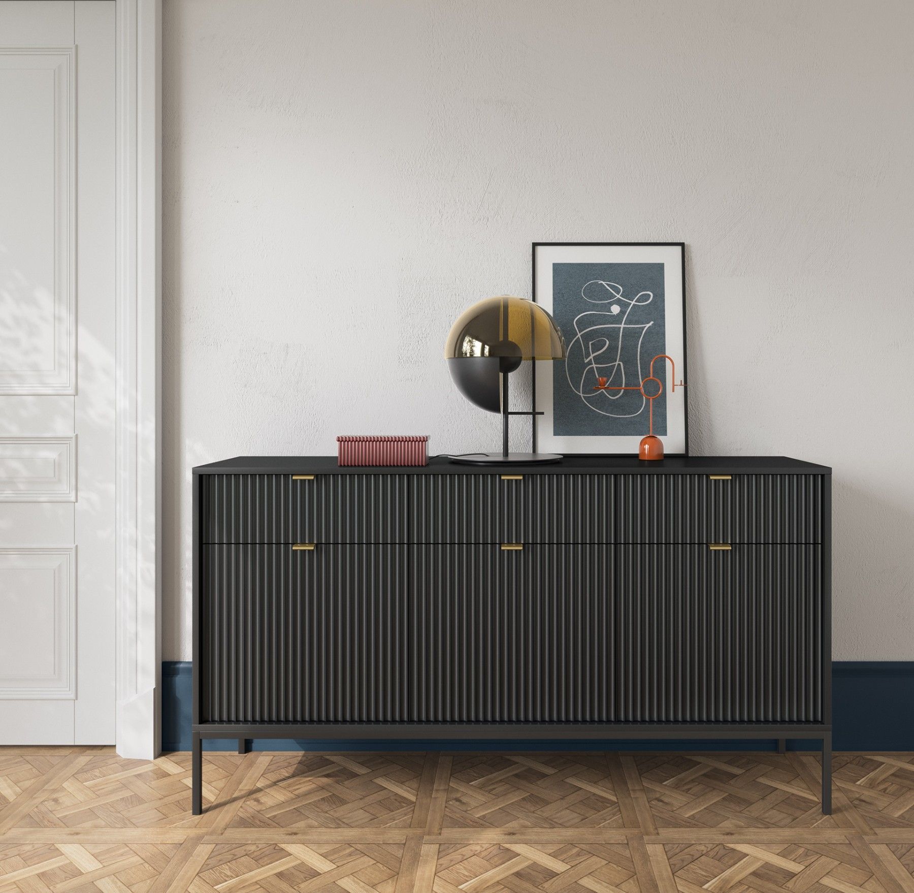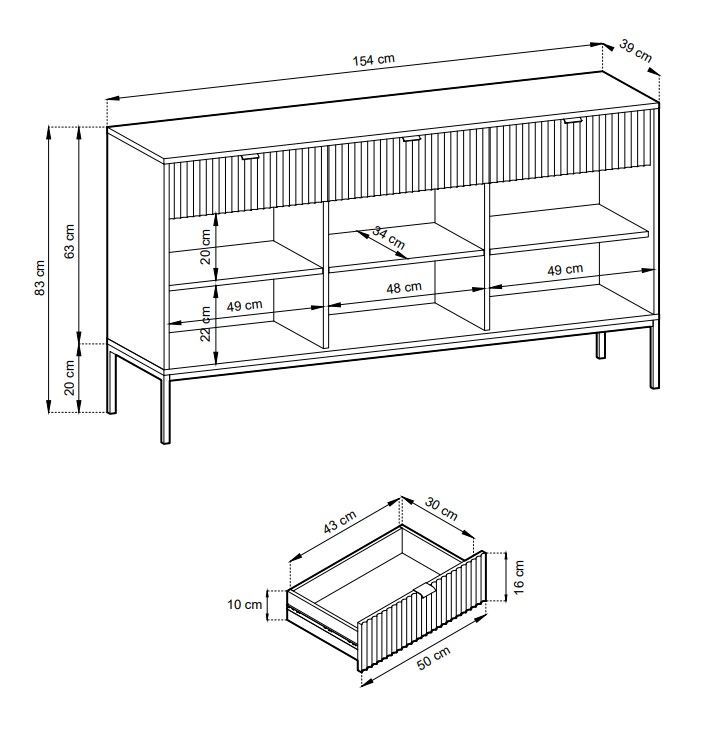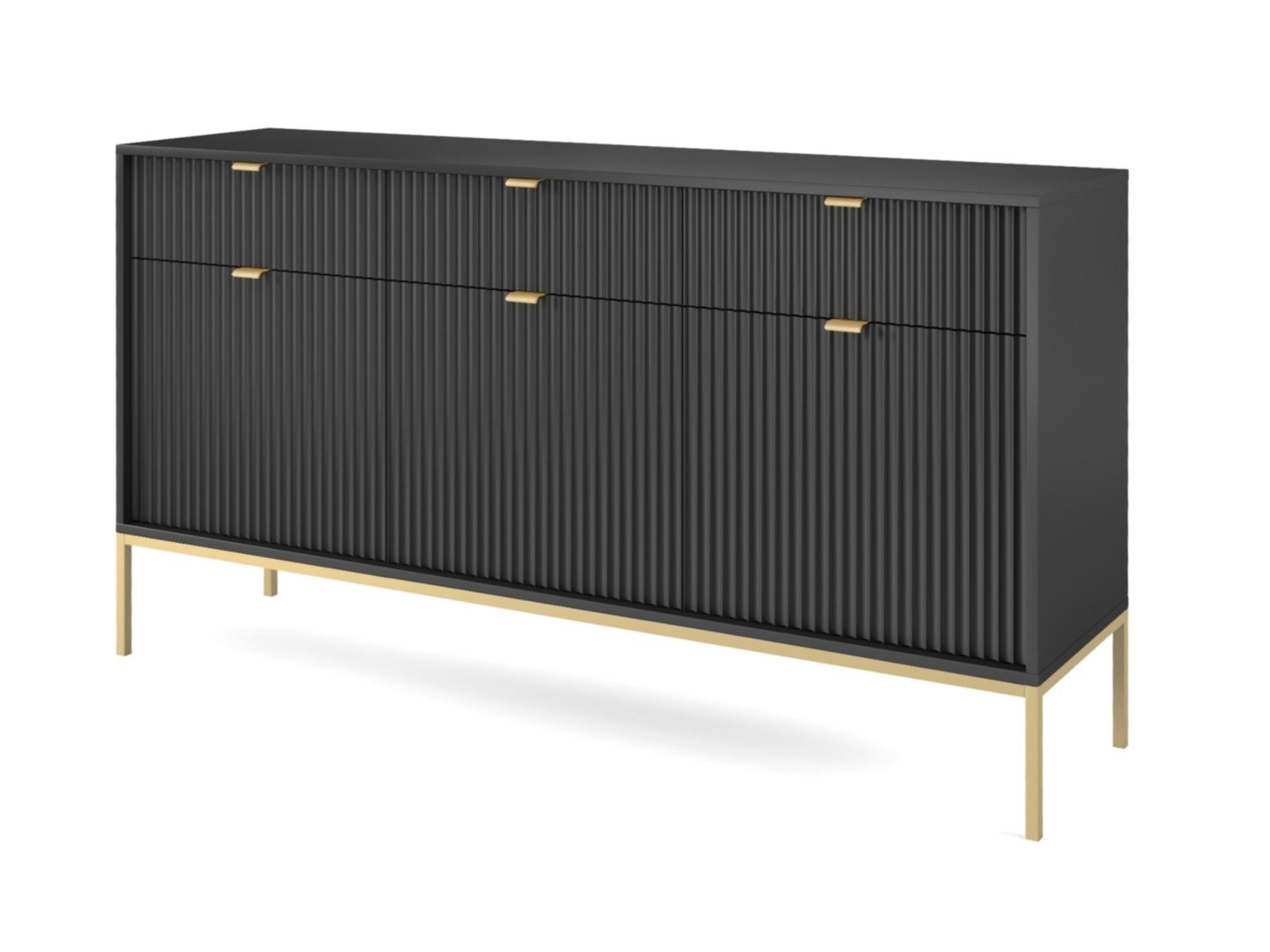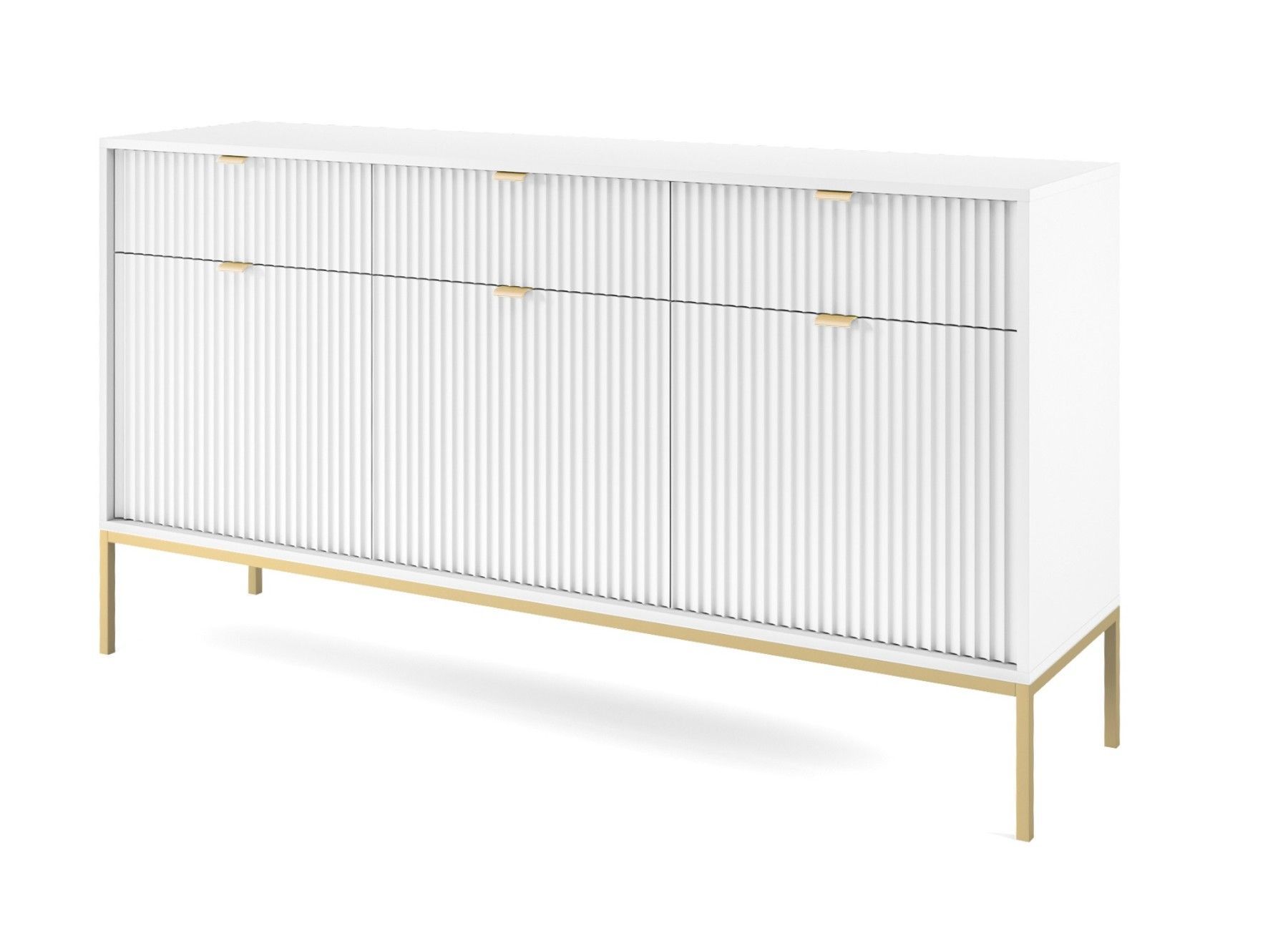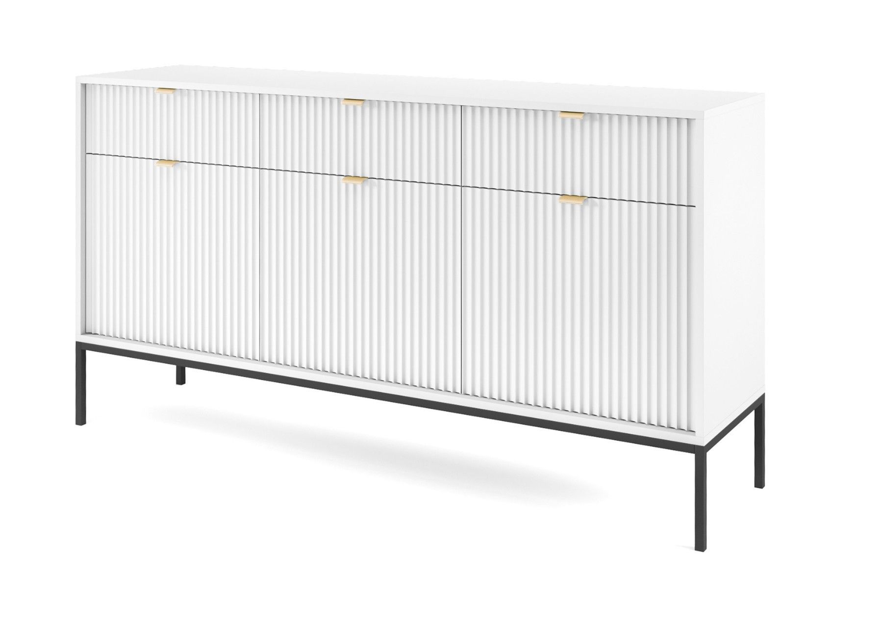 Sideboard 150 cm Galla, Dreitürige Kommode mit Schubladen - geriffelten Fronten