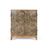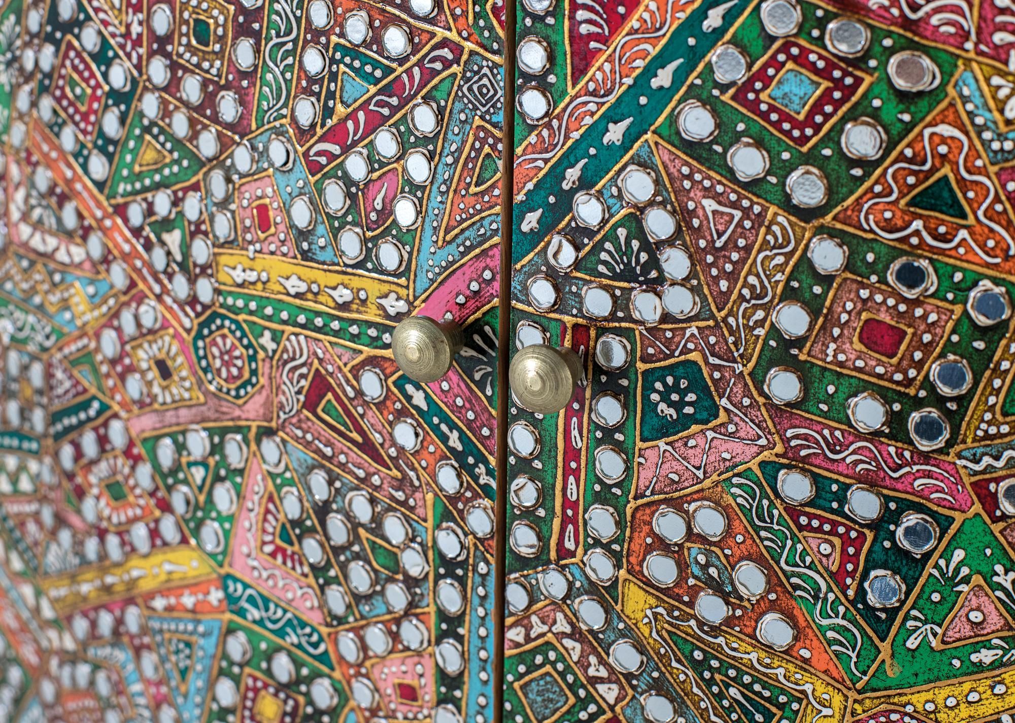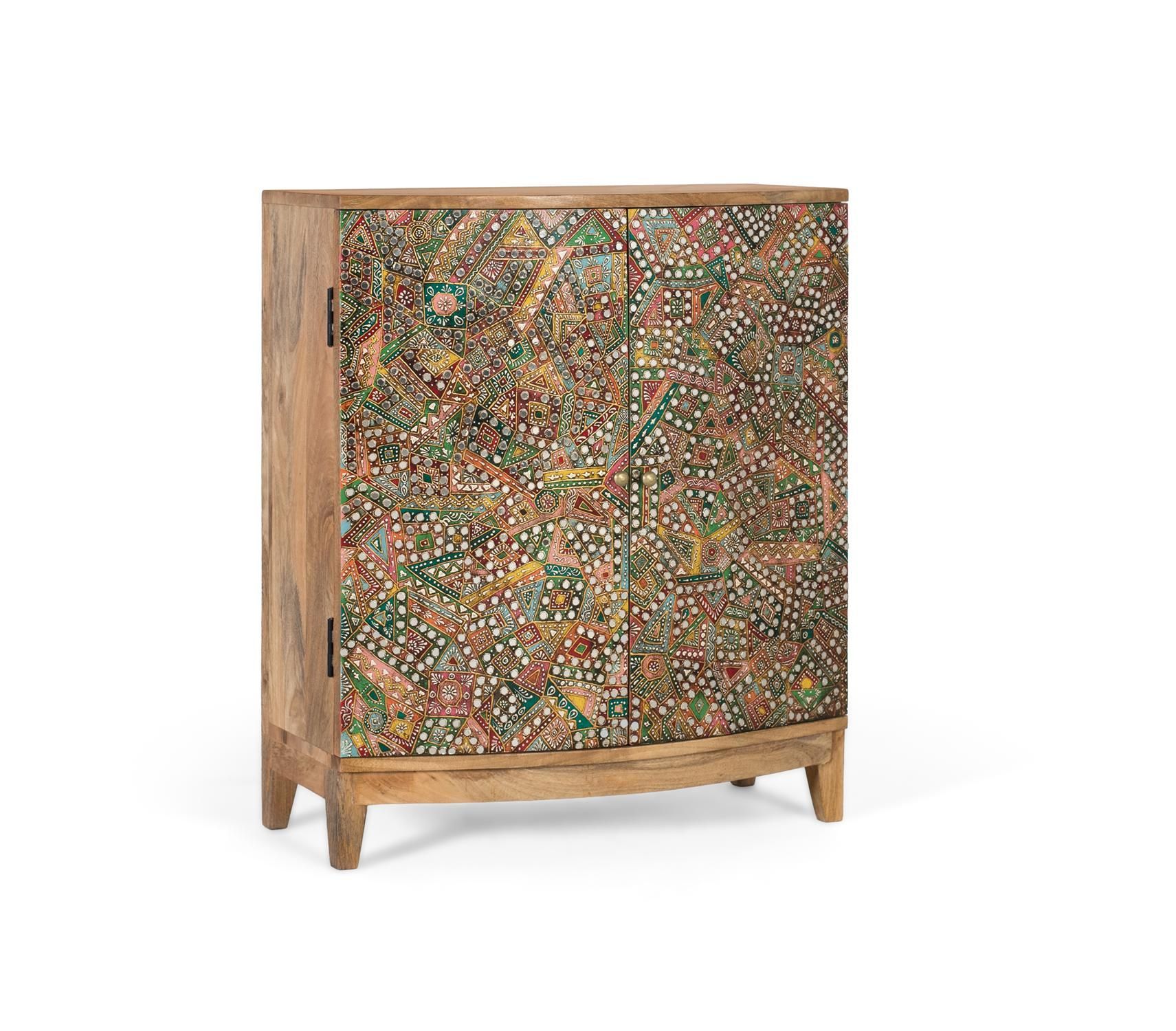 Dieses Sideboard aus Holz besticht durch sein kunstvolles und farbenfrohes Design. Es verfégt éber eine kompakte Struktur mit zwei sanft geschwungenen Vordertéren und einem Innenregal. Die Vorderseite ist reich verziert mit einem Mosaik aus geometrischen und floralen Mustern in leuchtenden Farbtönen