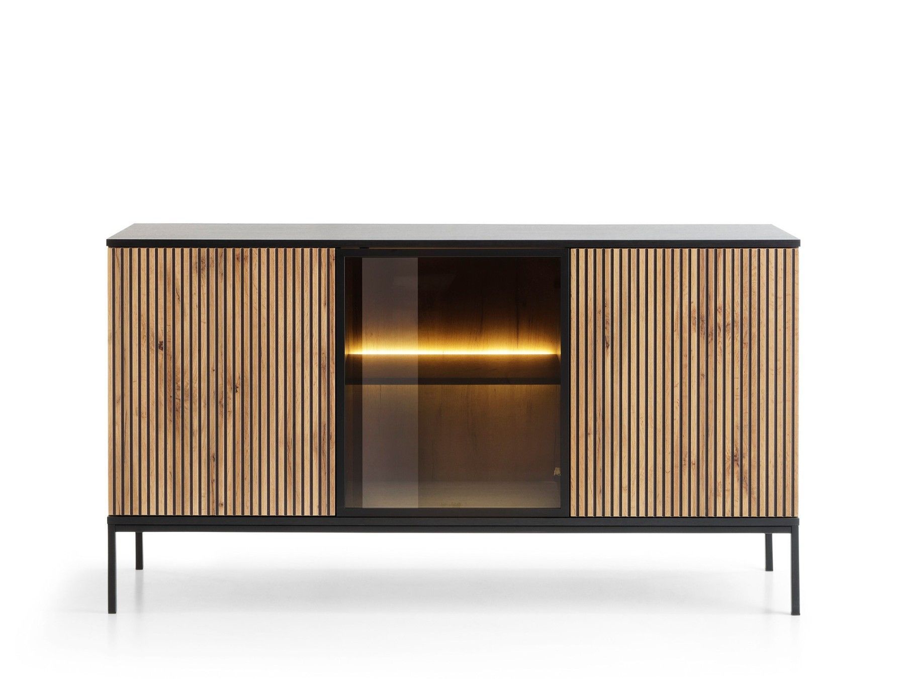 Sideboard Haller, Kommode mit Türen - LED-Beleuchtung, Holzbeinen, Lamellen, Loft