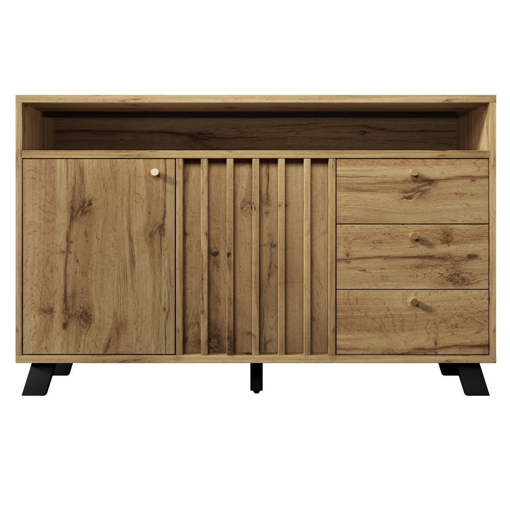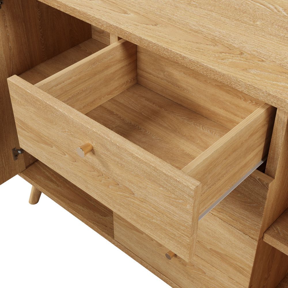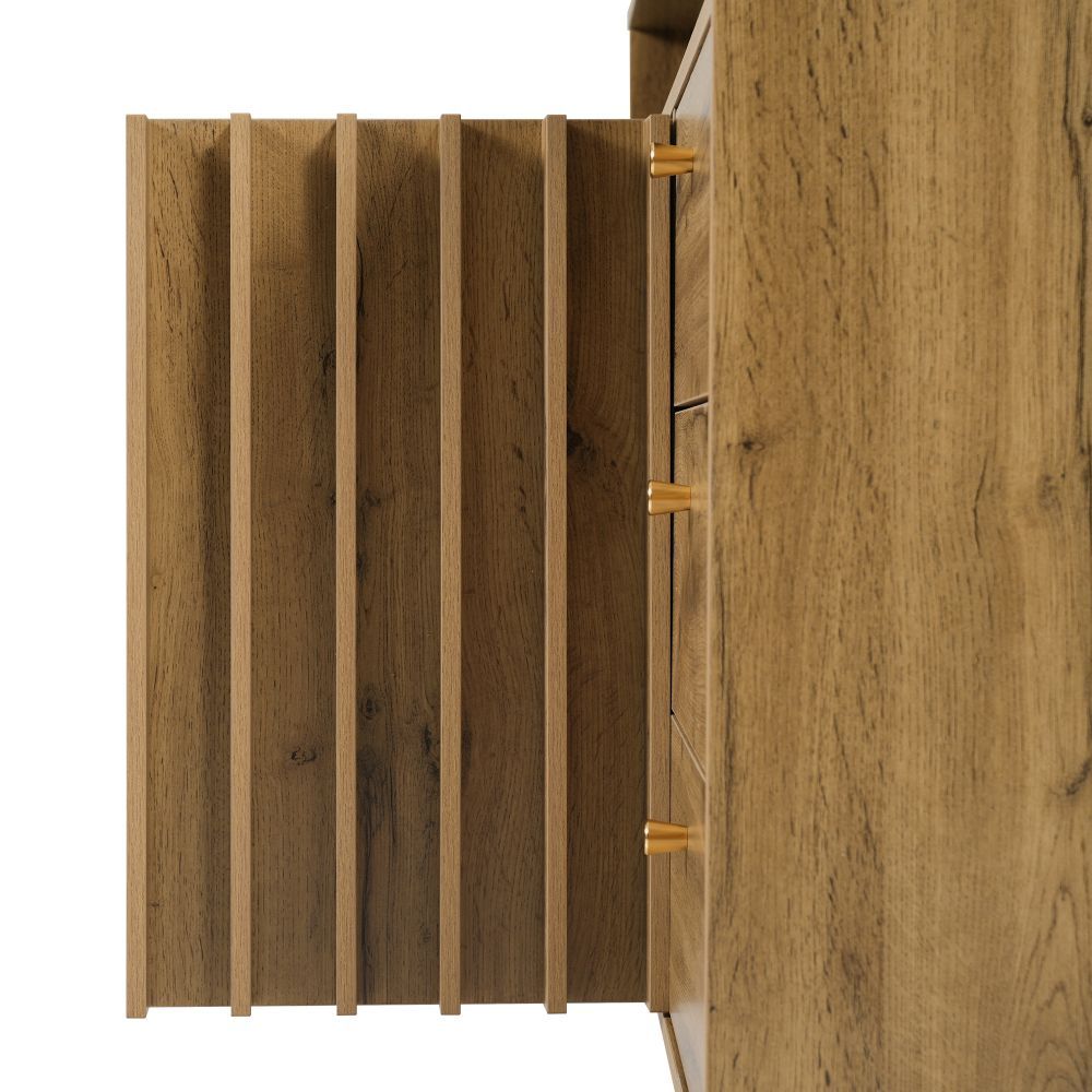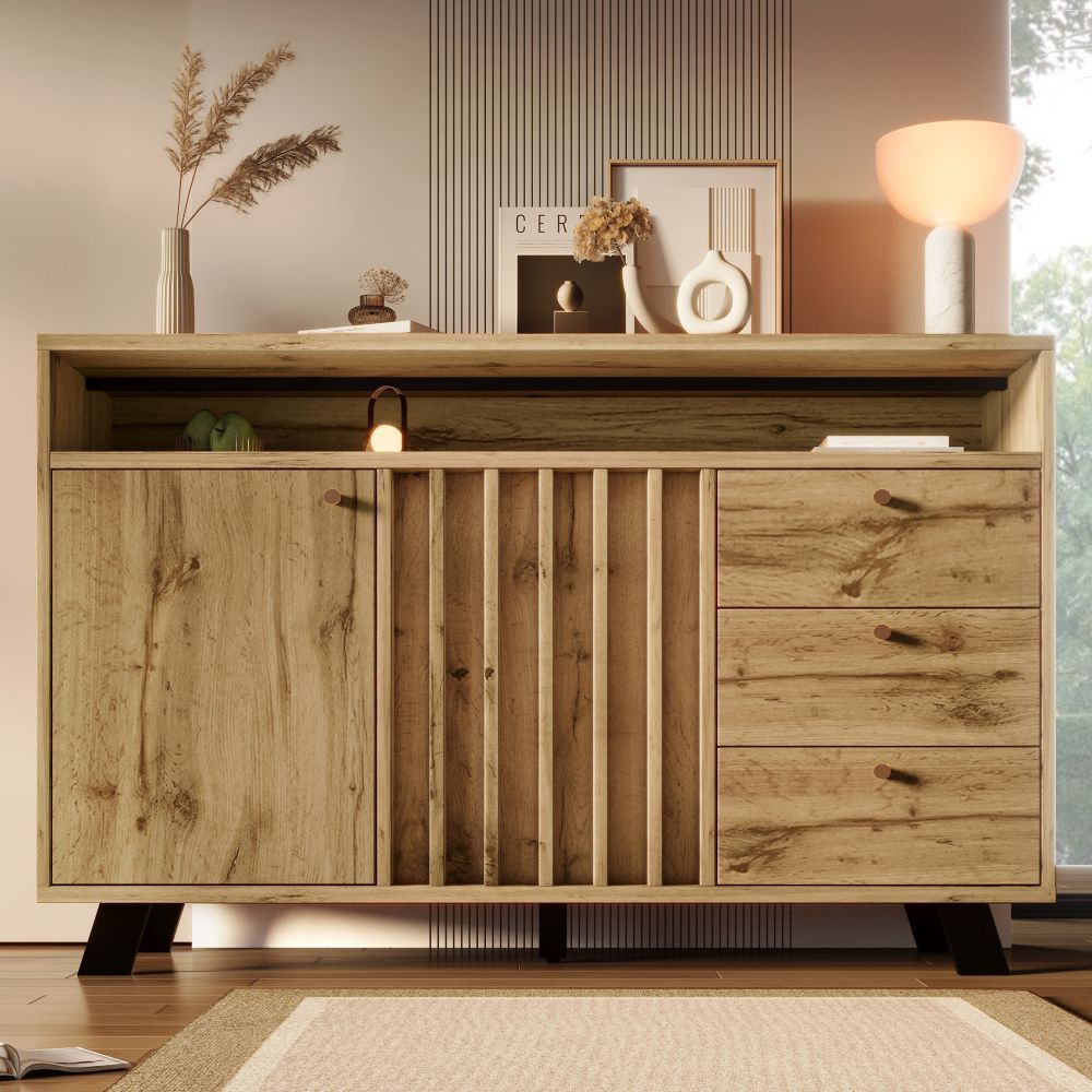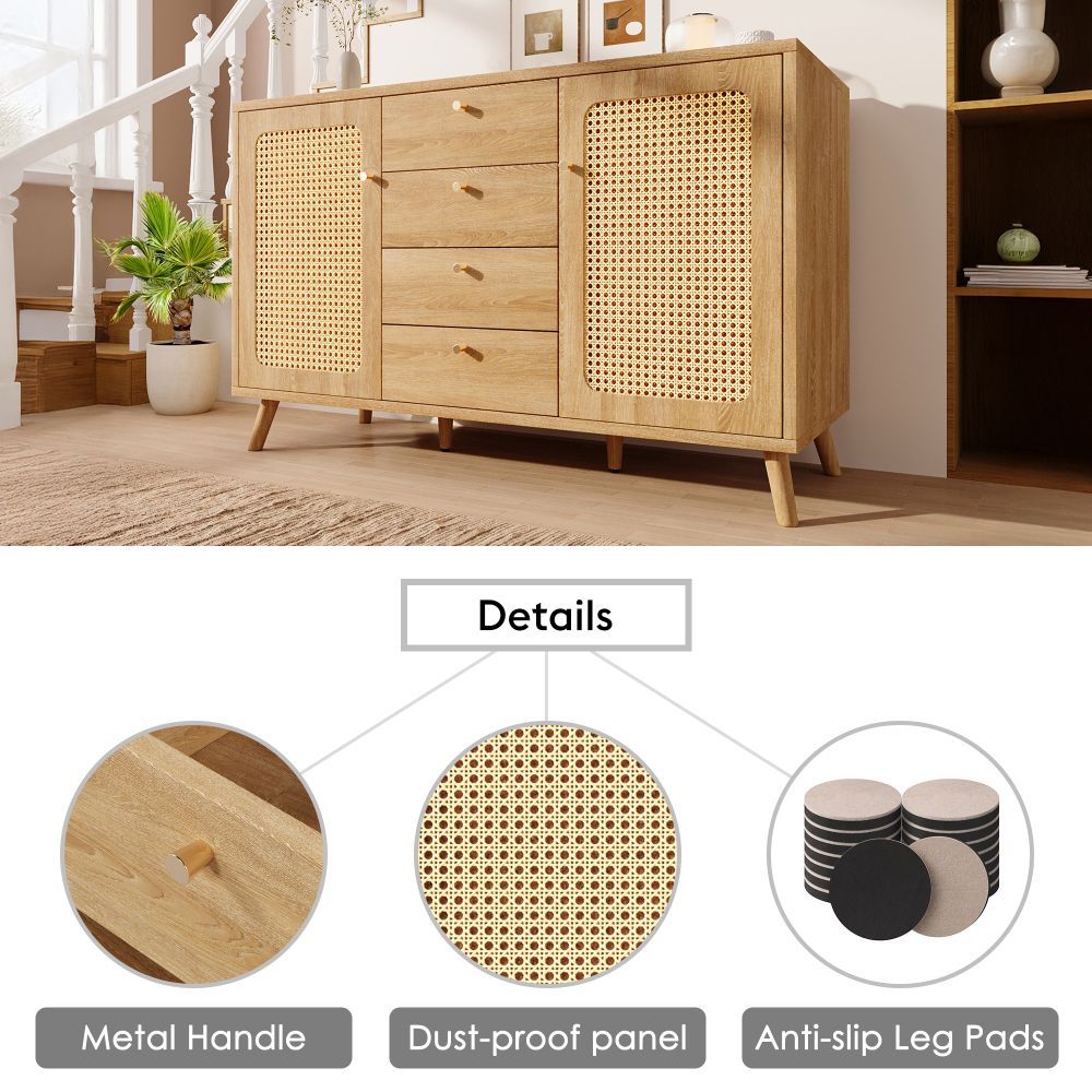 Dieses Sideboard in heller Eiche verbindet natürliche Rattan-Optik mit funktionalem Stauraum. Vier Schubladen und zwei Türen bieten Platz für Geschirr, Wohnaccessoires oder Alltagsgegenstände. Verstellbare Einlegeböden ermöglichen eine flexible Innenaufteilung. Ideal für Wohnzimmer, Esszimmer oder Flur.