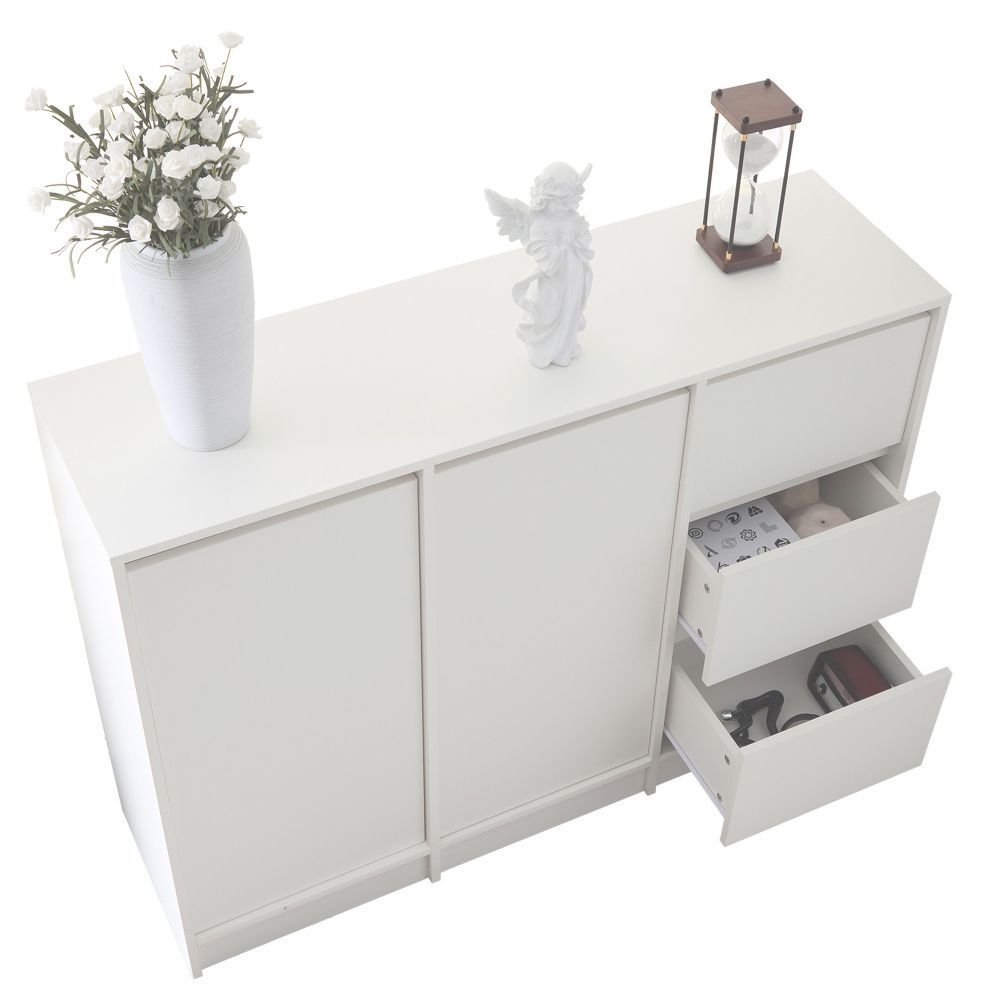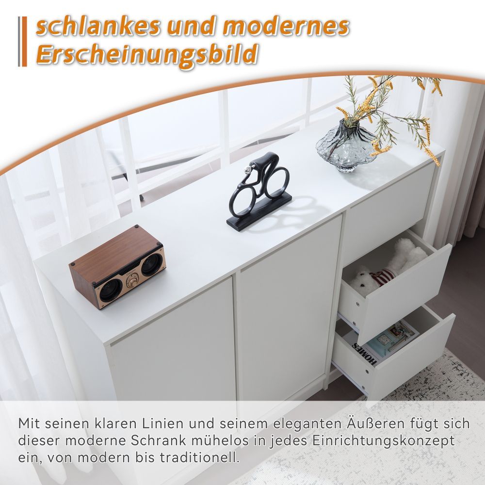 Moderne Sideboard-Kommode mit großem Stauraum für Flur, Wohnzimmer oder Küche. Aus robuster Spanplatte gefertigt, mit zwei Türen, Schubladen und einem verstellbaren Regal. Ideal zur ordentlichen Aufbewahrung von Schuhen, Geschirr oder Alltagsgegenständen.
