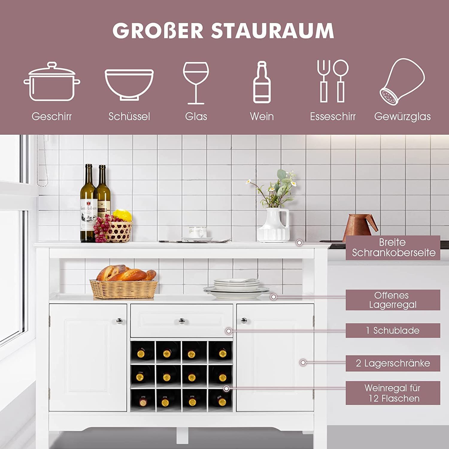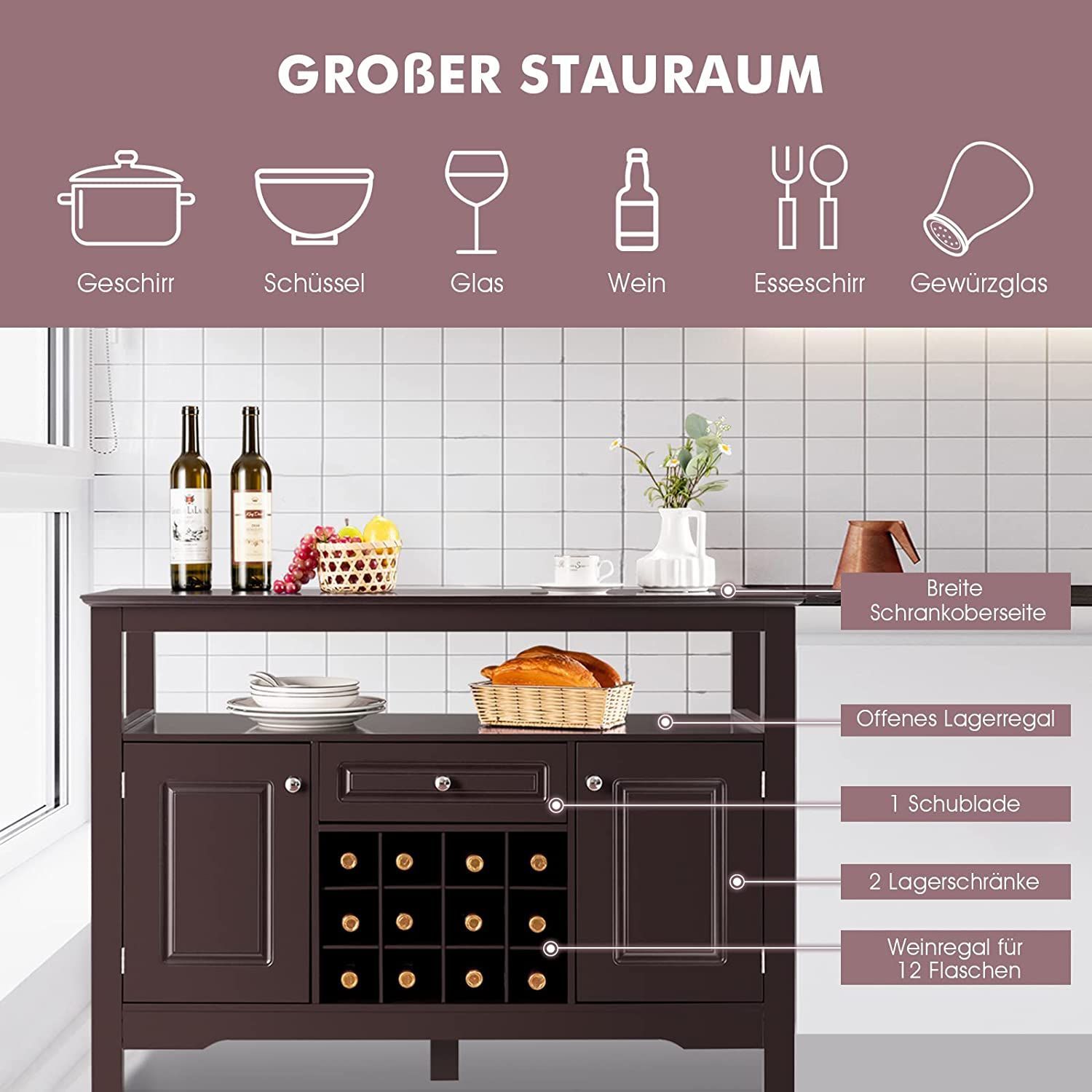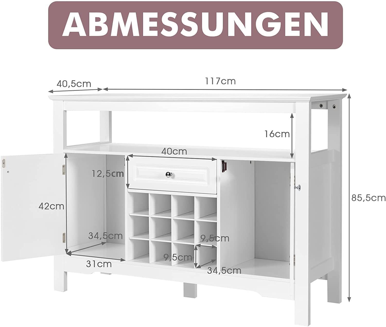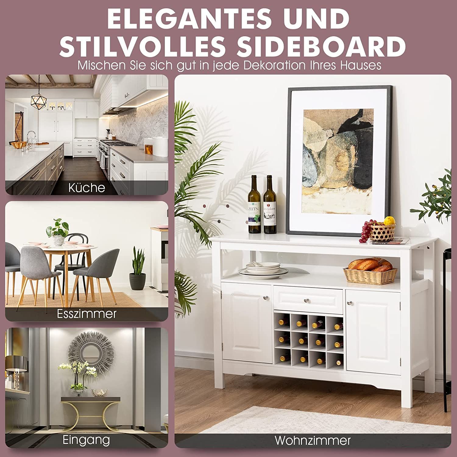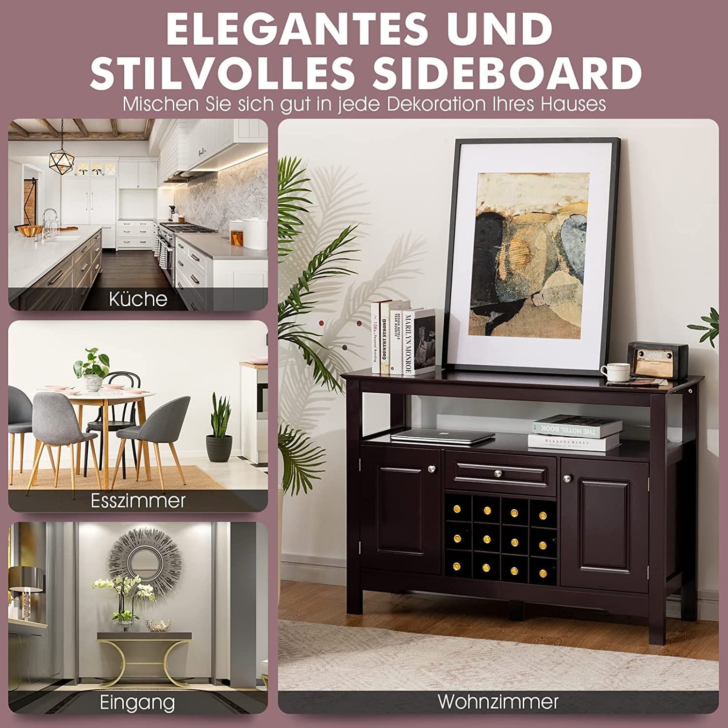 Sideboard Küchenschrank mit Türen und Schubladen, Konsolentisch Holz Küchekommode