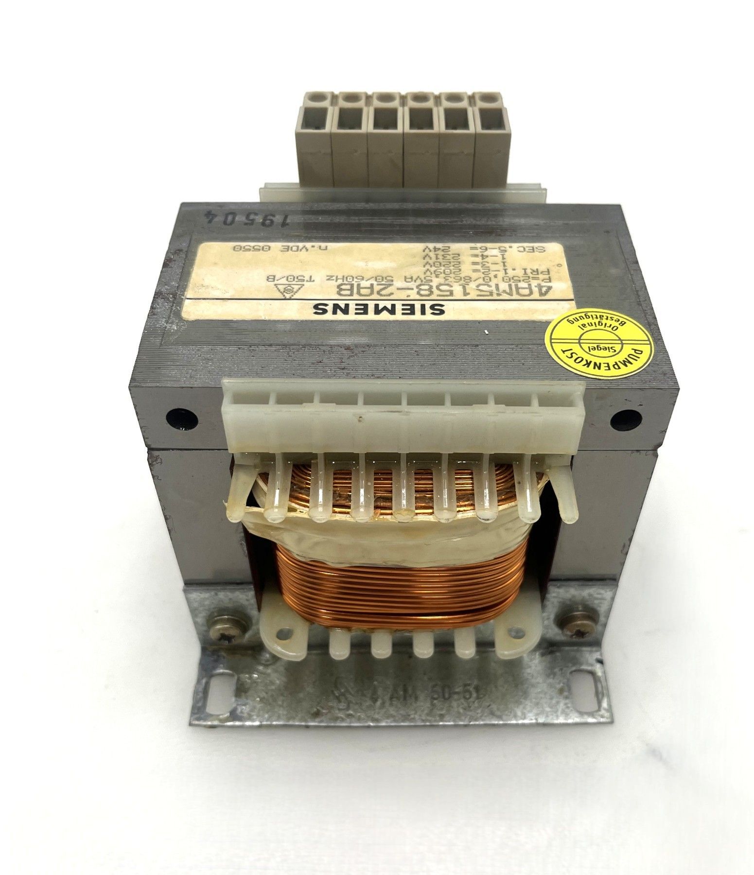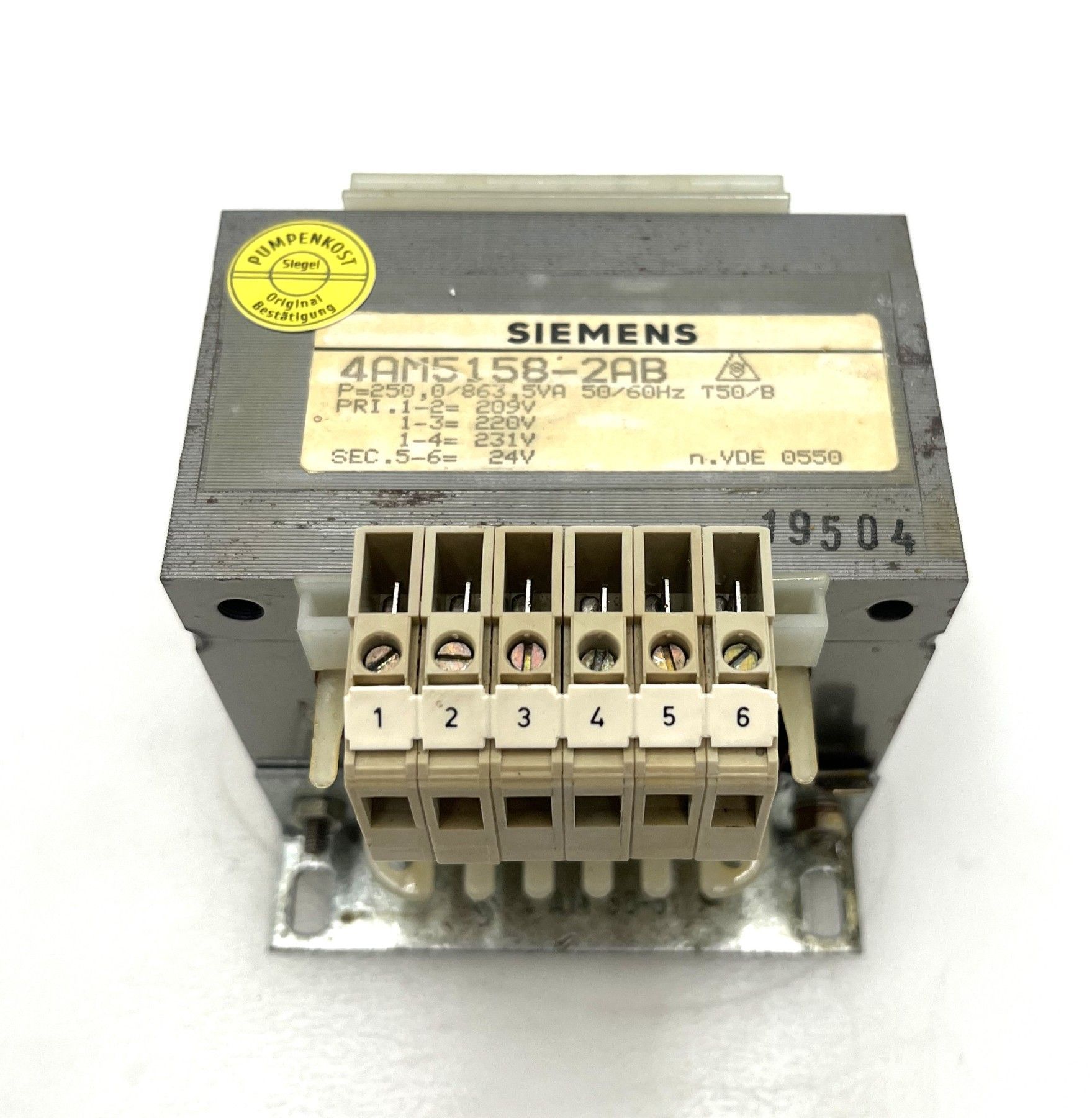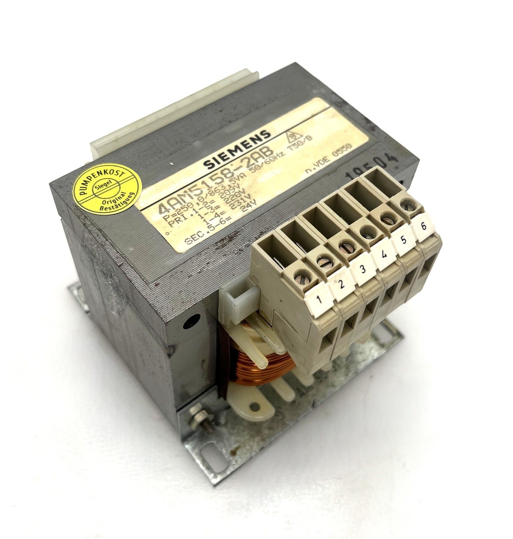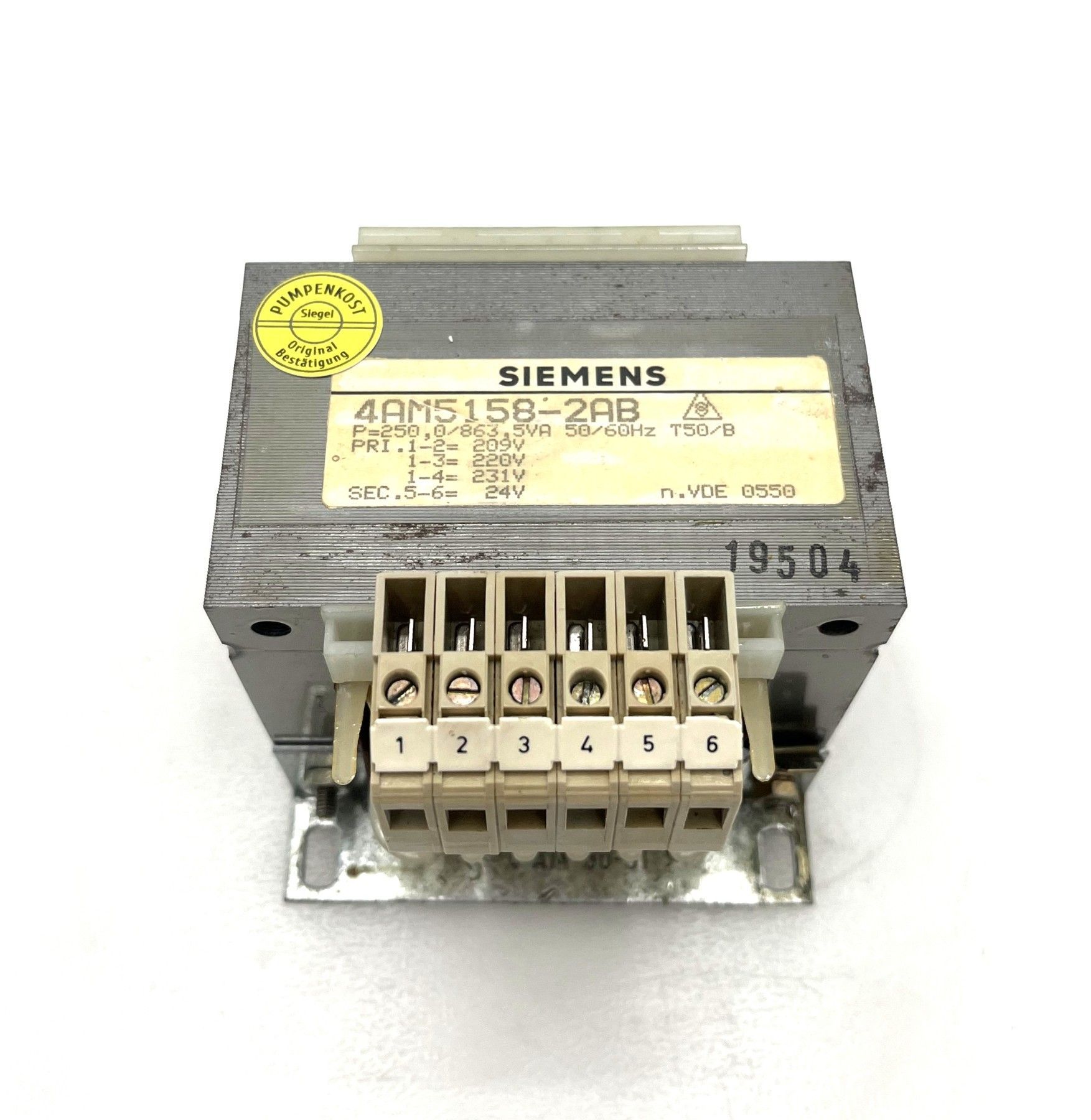 Siemens Transformator 4AM5158-2AB – 24V 250 VA Robuster und zuverlässiger Transformator von Siemens , ideal für den Einsatz in Schaltschränken, Steuerungen und Industrieanlagen . Technische Daten Hersteller: Siemens Typ: 4AM5158-2AB Norm: VDE 0550 Primärspannung: 209 V 220 V 231 V Sekundärspan